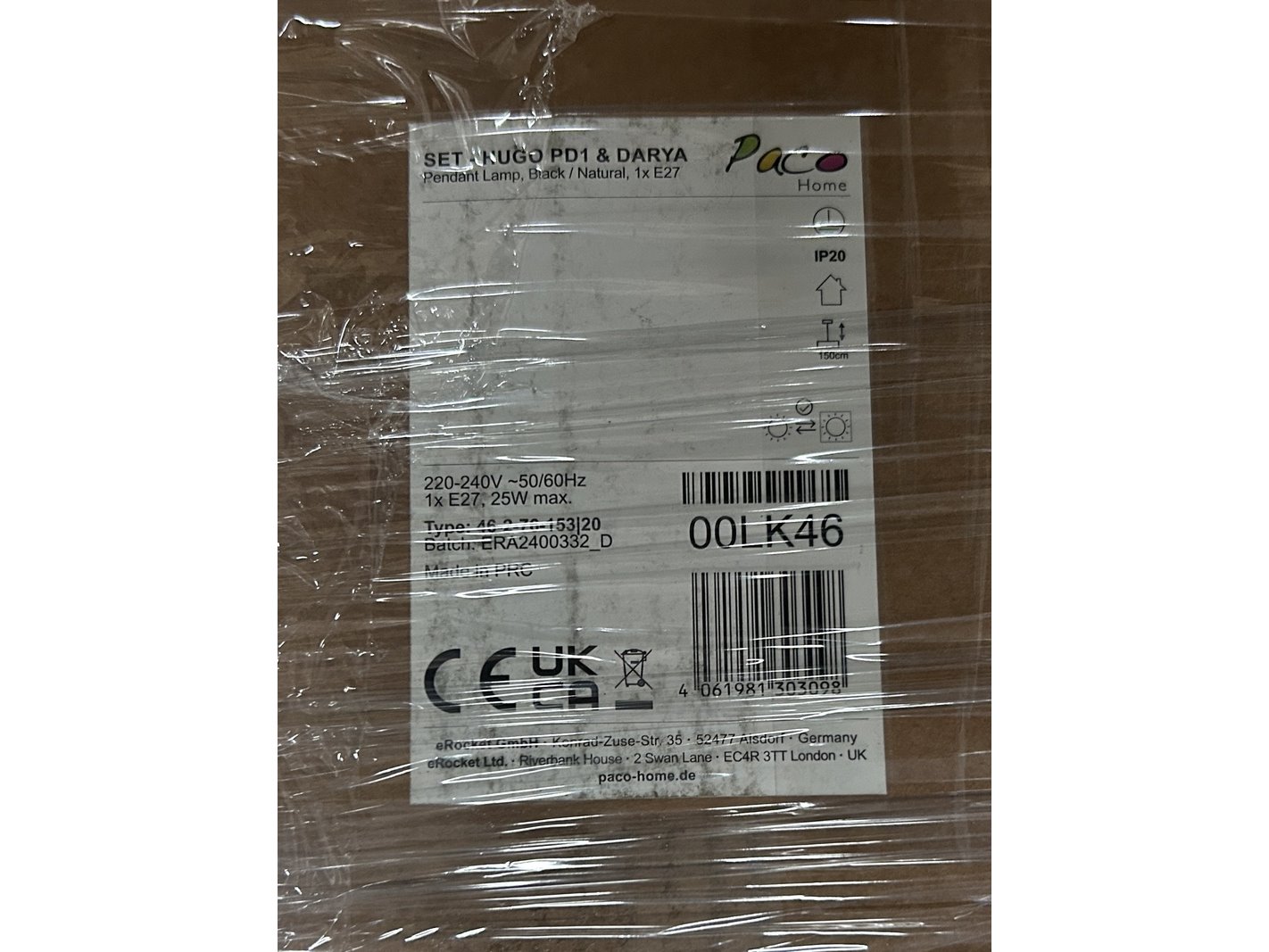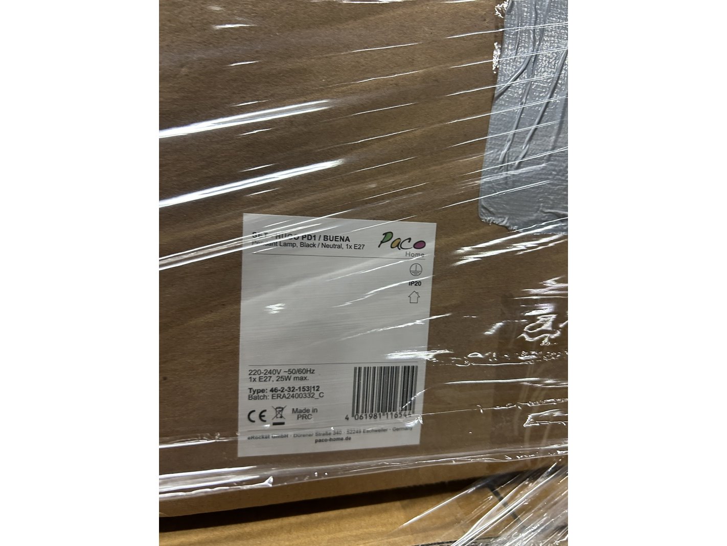 Product: Design verlichting Paco Home Specificaties: Pallet met design verlichting van Paco Home, rechtstreeks afkomstig uit het fulfilment center. De dozen zijn ongeopend en niet gesorteerd. De inhoud kan bestaan uit nieuwe producten, demo artikelen of items met beschadigingen of ontbrekende onderdelen. Soms gaat het alleen om een beschadigde verpakking, maar het kan ook voorkomen dat het product zelf beschadigd of incompleet is.