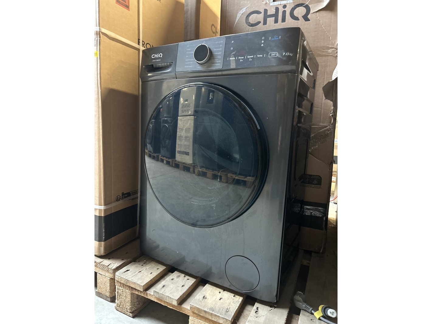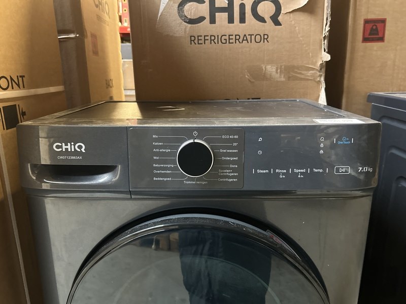 Merk: CHiQ Product: Wasmachine 7 kg AI Smart energieklasse A Afmeting: 600x465x850 mm Specificaties: Demo model. Beschadigd door transport.