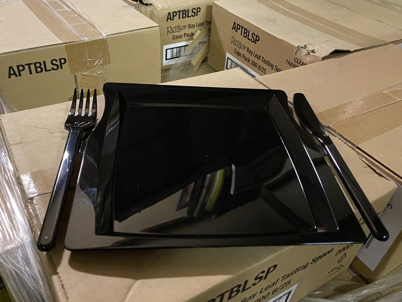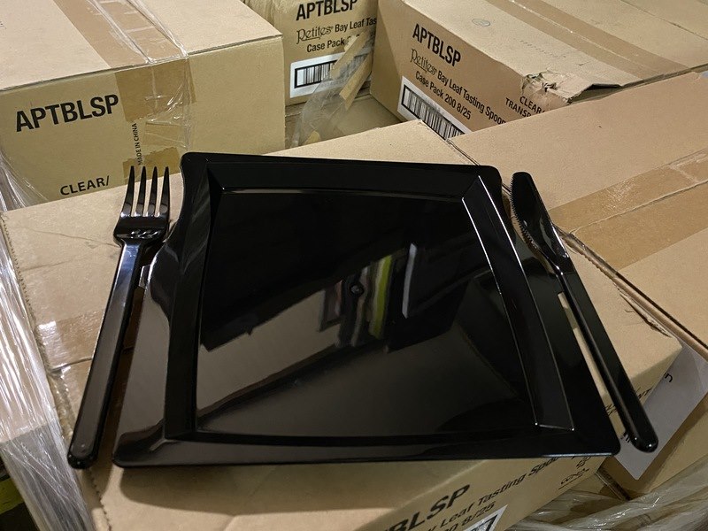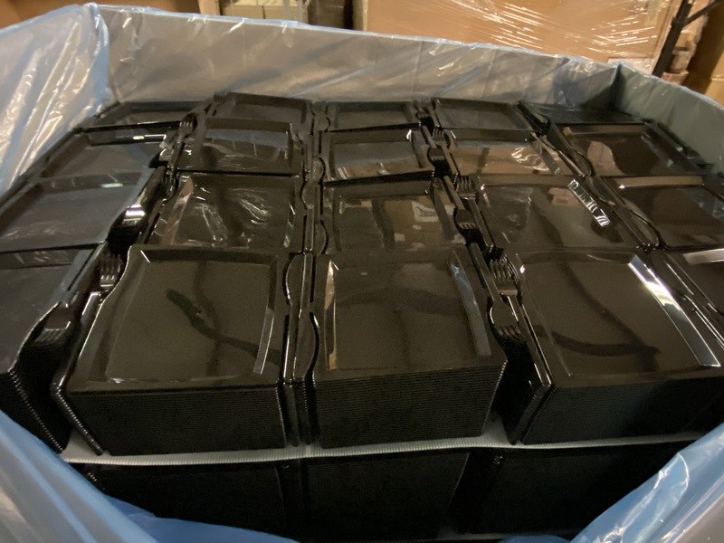 Product: luxe party evenementborden met bestek Kleur: zwart Afmeting: 30x20xcm Conditie: nieuw Specificaties: Ideaal voor feestelijke gelegenheden zoals verjaardagen, verlovingsfeesten, bruiloften, kamperen, zomerfeesten, jubilea en barbecuefeesten, worden vanuit bulkpallet uitgeteld