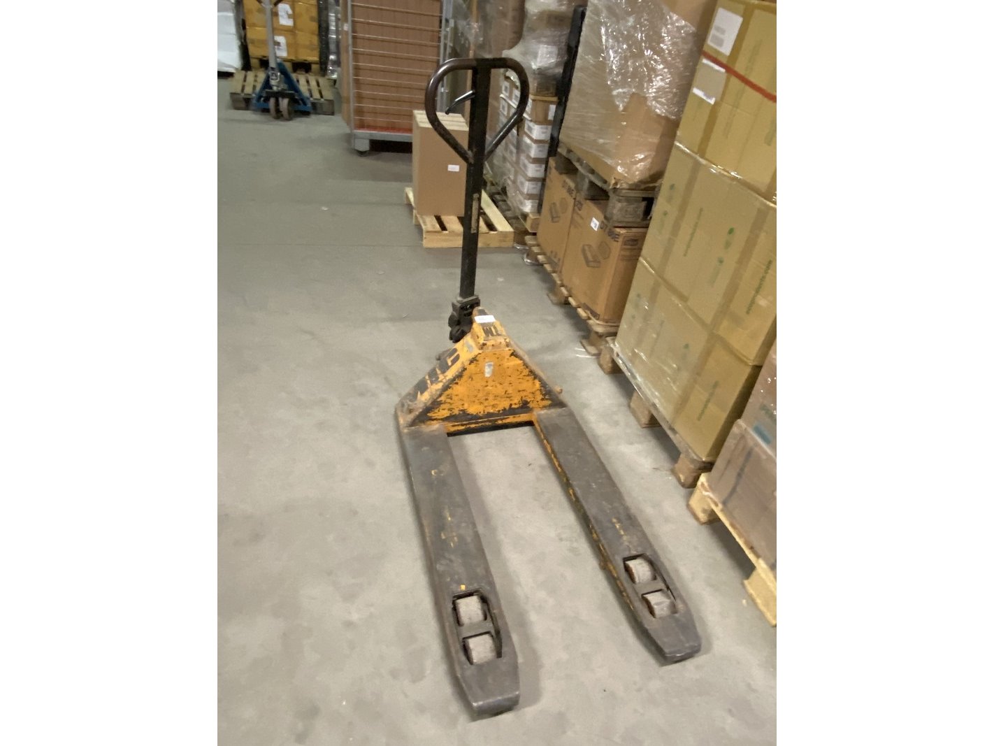 Merk: Mic Product: palletwagen met brede lepels Conditie: nieuw Specificaties: Palletwagen Mic TM 2000 met brede lepels, ideaal voor blokpallets