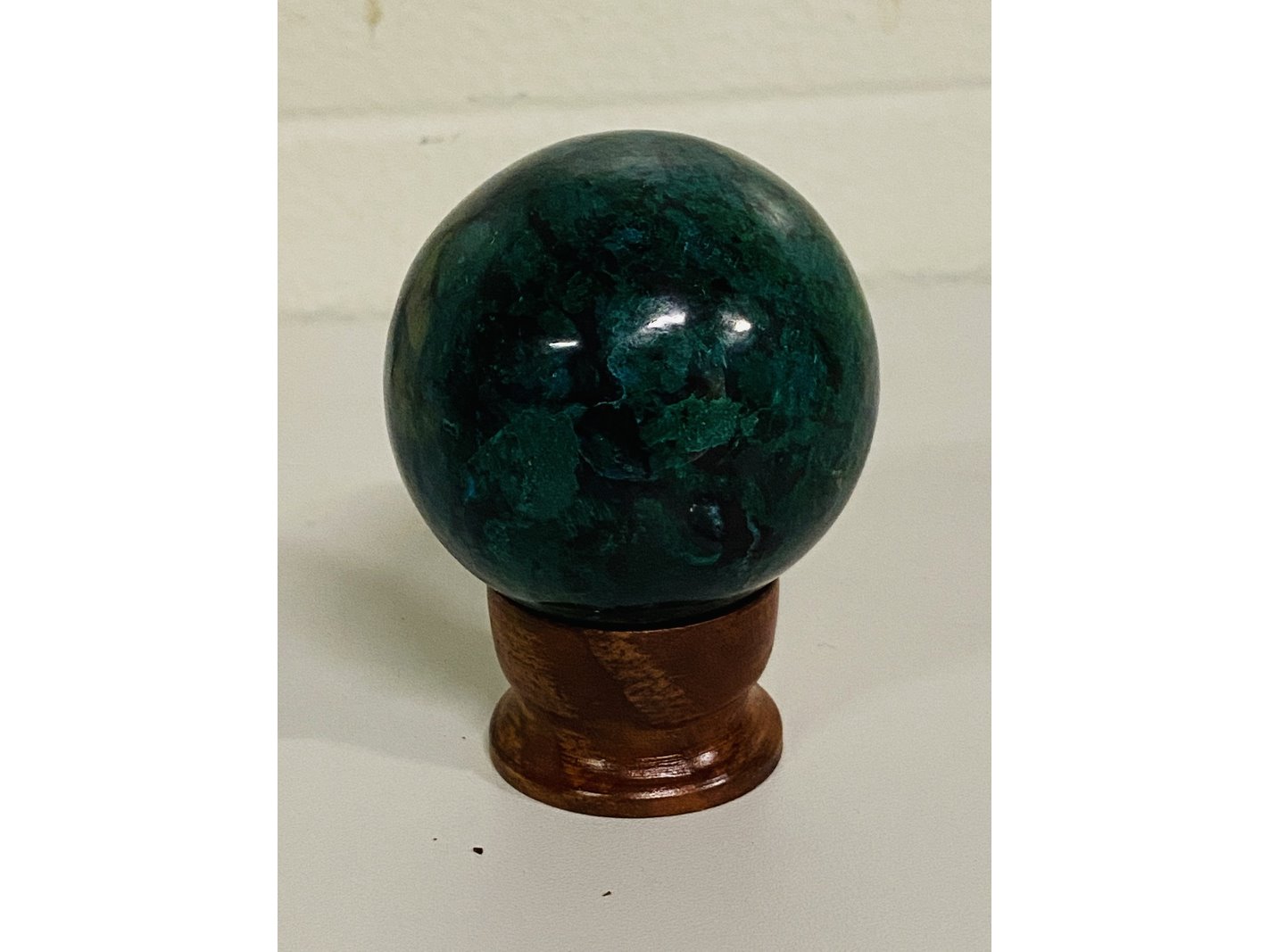 Product: Chrysocolla bol met standaard Materiaal: Edelsteen Afmeting: ca 384 gram; 5,9 cm doorsnee Conditie: nieuw Specificaties: 1 Chrysocolla bol uit Peru met houten standaard