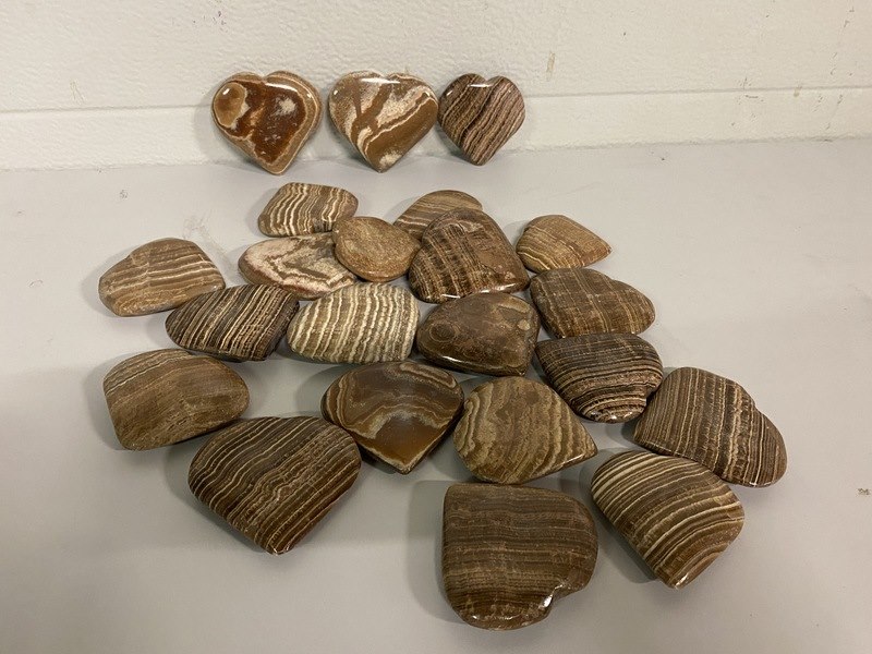 Product: Aragoniet harten Kleur: Bruin Materiaal: Edelsteen Afmeting: ca 6-7,5cm in doorsnee Conditie: nieuw Specificaties: 20 Aragoniet harten van 6-8cm. Komen uit Marokko