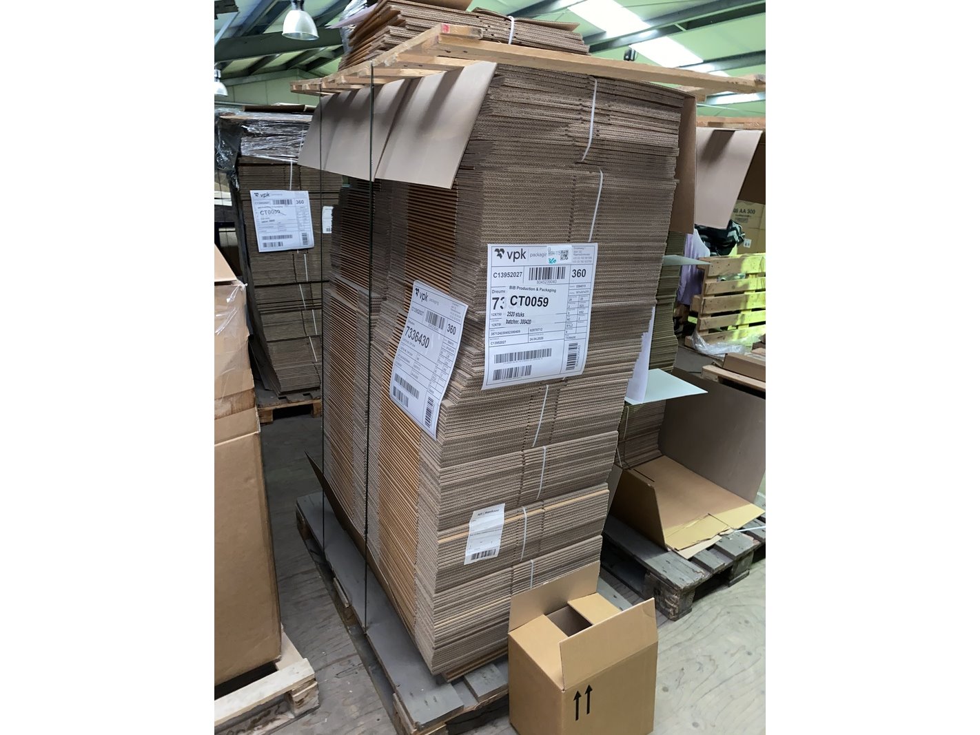 Product: Pallet ca. 360 verzenddozen 30x23x27cm dubbelgolf Kleur: Bruin Afmeting: 30x23x27cm Conditie: nieuw Specificaties: Stevige dubbelgolf verzenddozen.