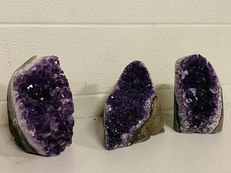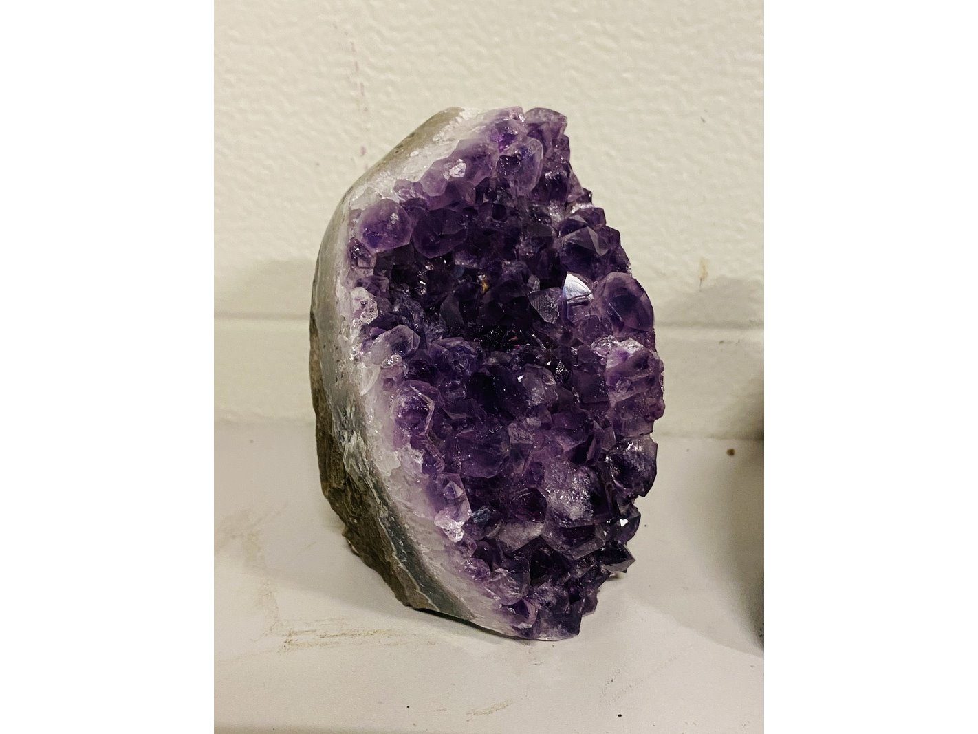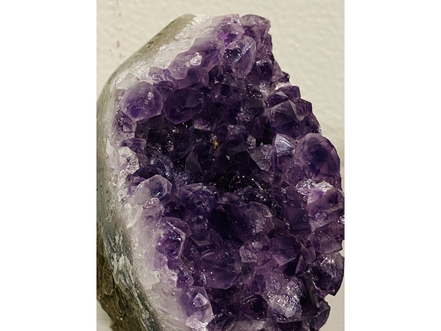 Product: Amethist druse staand/liggend Kleur: Paars Materiaal: Edelsteen Afmeting: ca 3700 gram; 12 - 13 cm hoogte Conditie: nieuw Specificaties: 3 Amethist gepolijste geodes uit Uruguay met een gewicht van ca 3700 gram