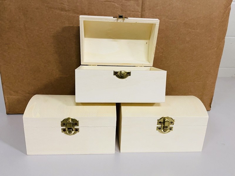 Product: Houten kistjes Materiaal: Hout Afmeting: ca 14,5 x 9 x 8,3cm Conditie: nieuw Specificaties: 36 Houten schatkistjes met deksel