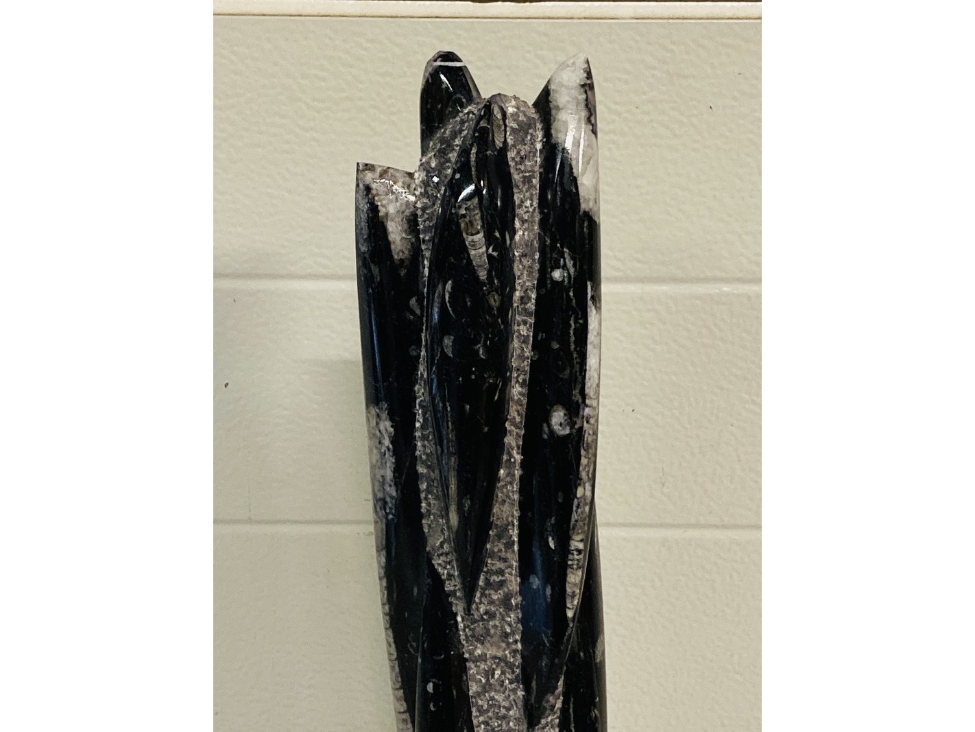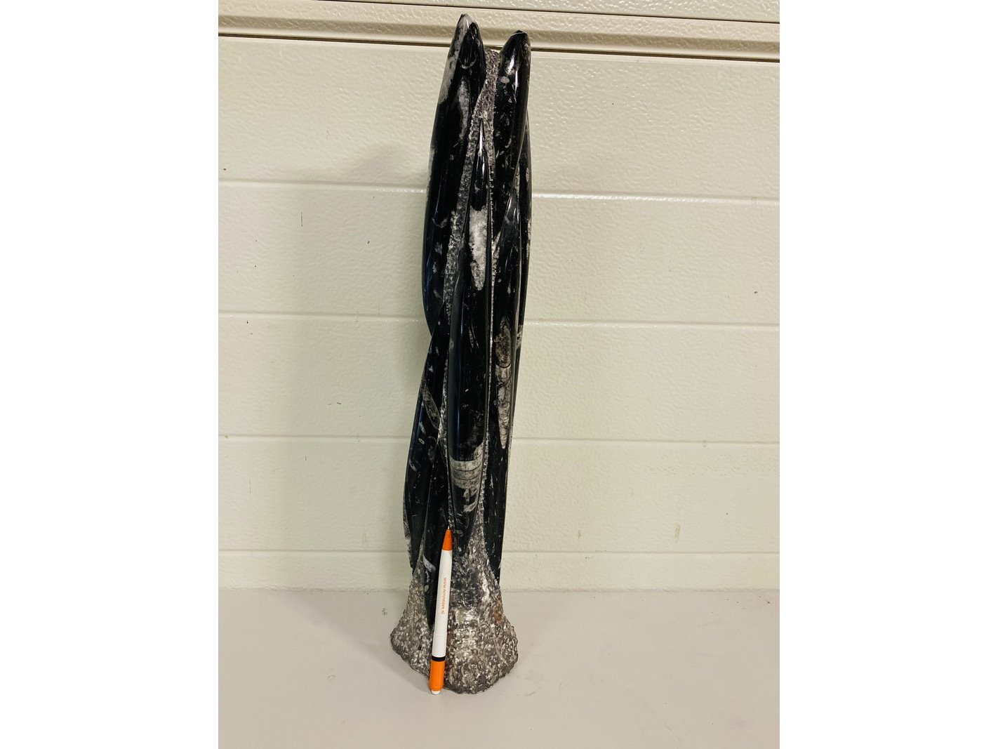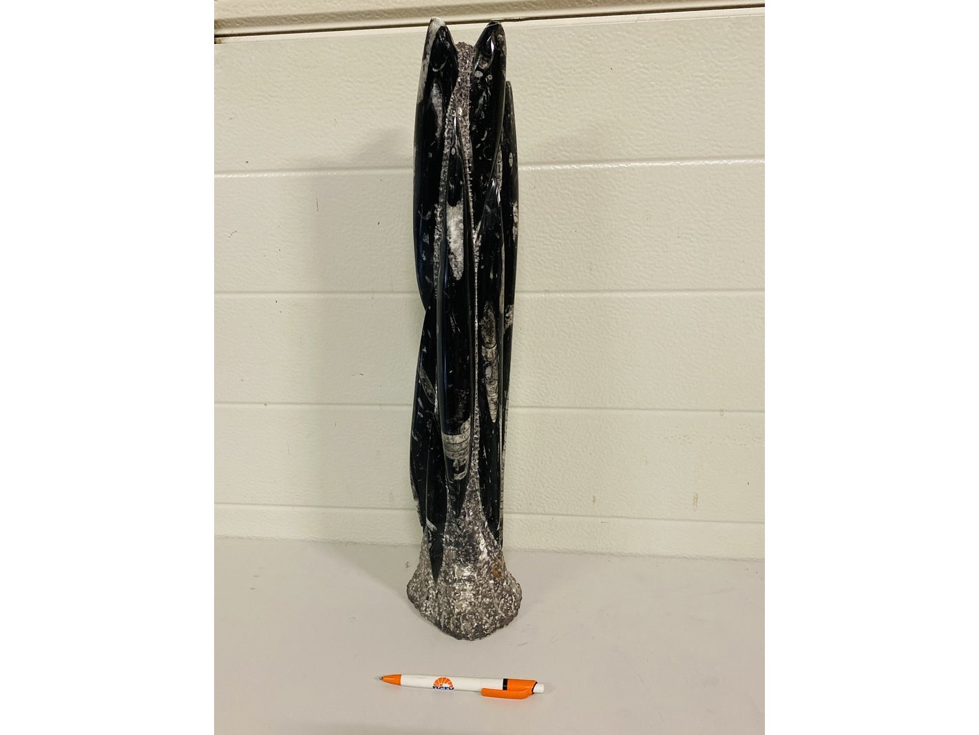 Product: Orthoceras toren Materiaal: Fossiel Afmeting: ca 53 cm hoog; 5800 gram Conditie: nieuw Specificaties: Grote toren met Orthoceras fossielen uit Marokko