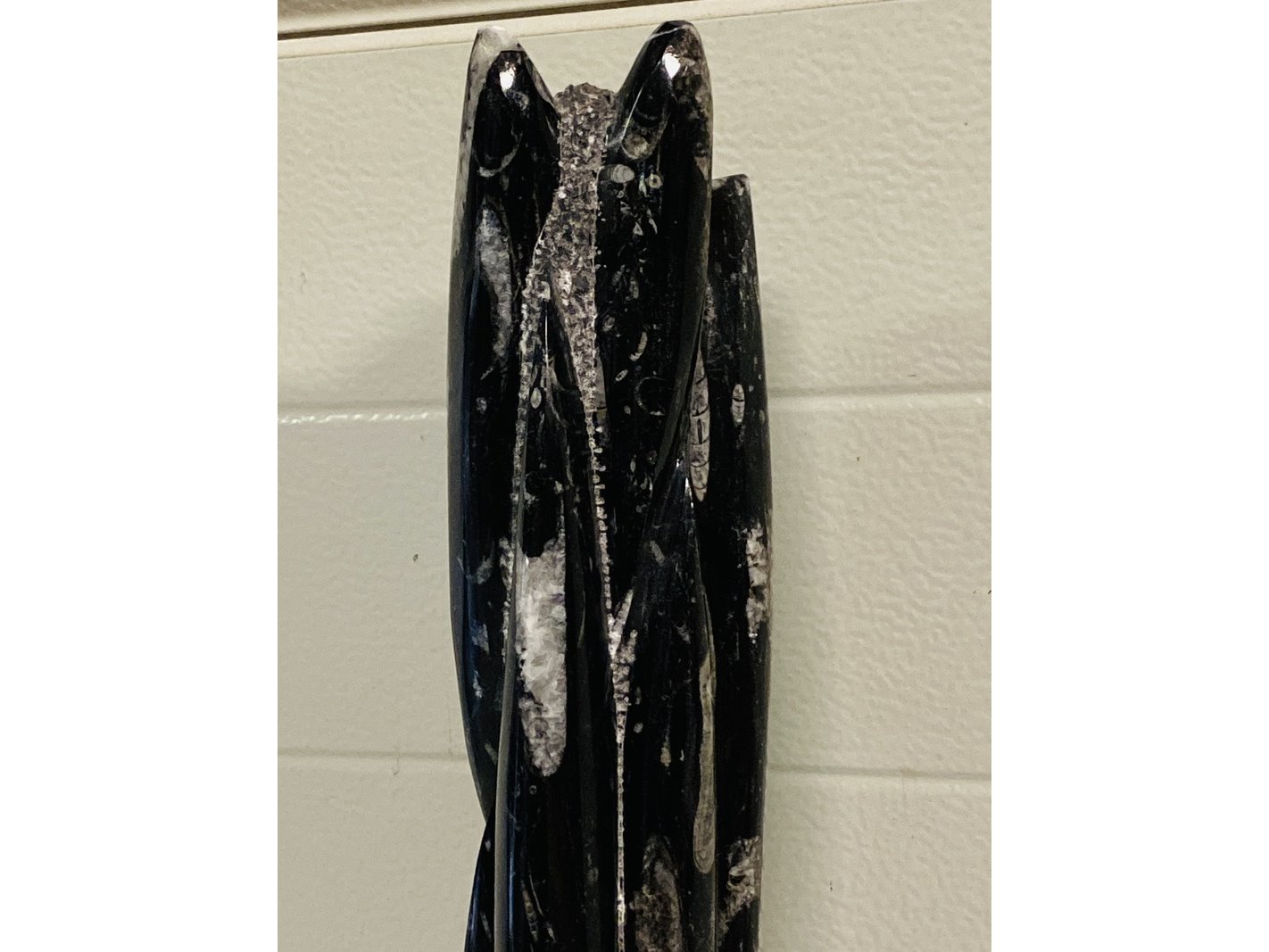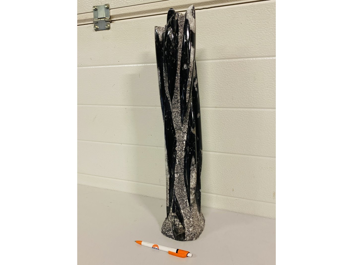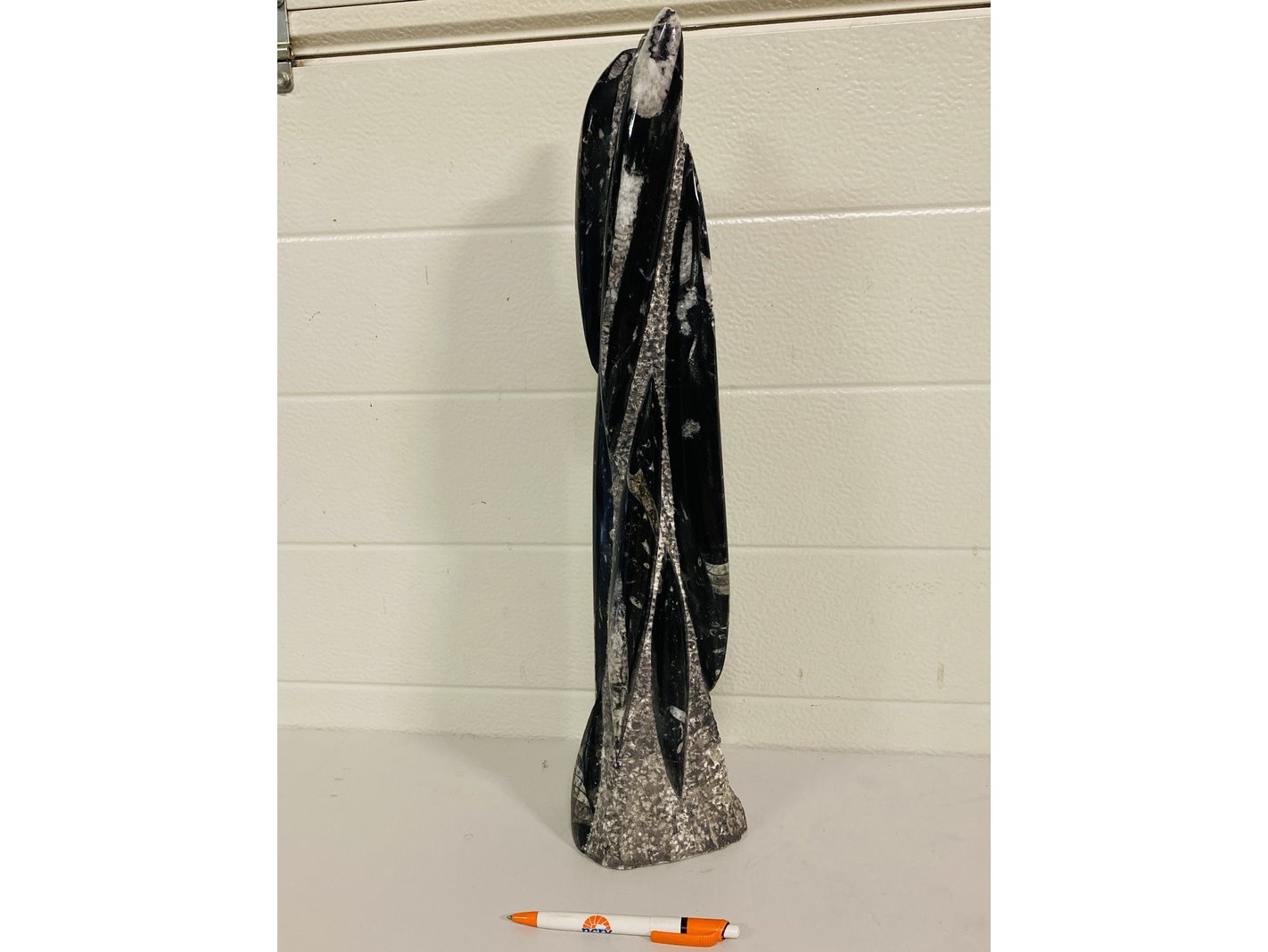 Product: Orthoceras toren Materiaal: Fossiel Afmeting: ca 53 cm hoog; 5800 gram Conditie: nieuw Specificaties: Grote toren met Orthoceras fossielen uit Marokko