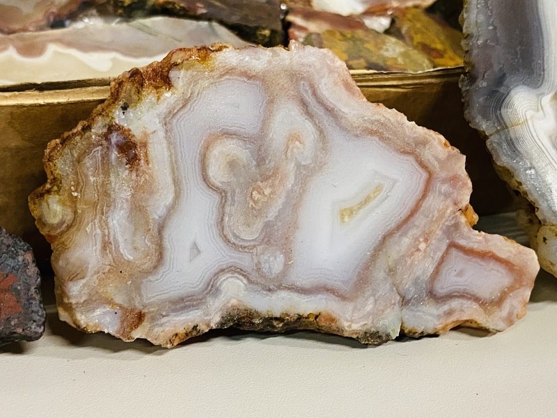 Product: Agaat / Chalcedoon plakken Materiaal: Edelsteen Afmeting: ca 2300 gram; 2,5 - 14,5 cm Conditie: nieuw Specificaties: 22 ongepolijste plakken van Agaat met Chalcedoon.