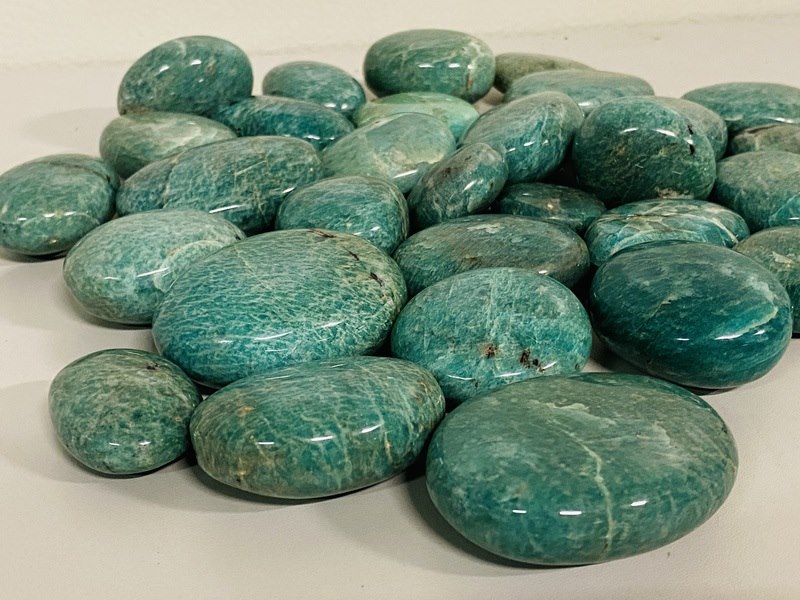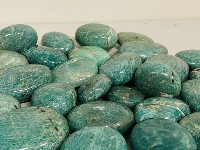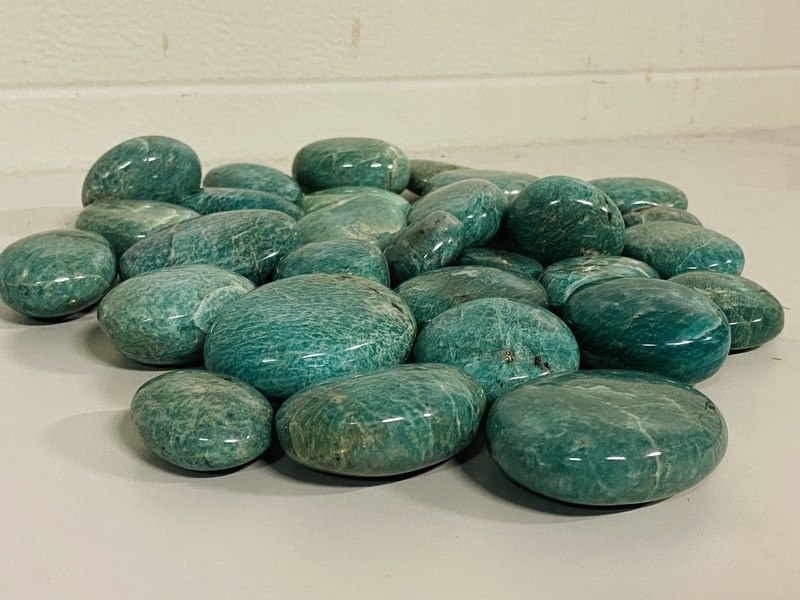 Product: Amazoniet handsteen Materiaal: Edelsteen Afmeting: ca 2515 gram, ca 4 - 7 cm Conditie: nieuw Specificaties: 30 handstenen Amazoniet uit Madagaskar