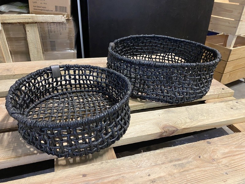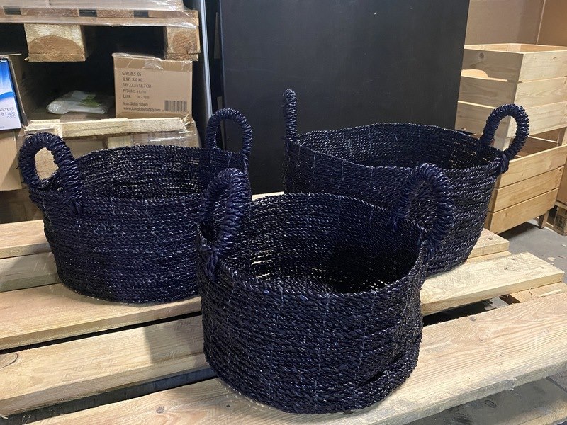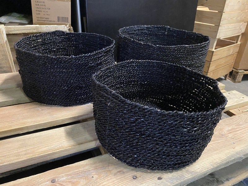 Product: Diverse afmetingen handgemaakte manden Conditie: nieuw Specificaties: Partij diverse manden in diverse maten van 30 tot 50 cm doorsnede
