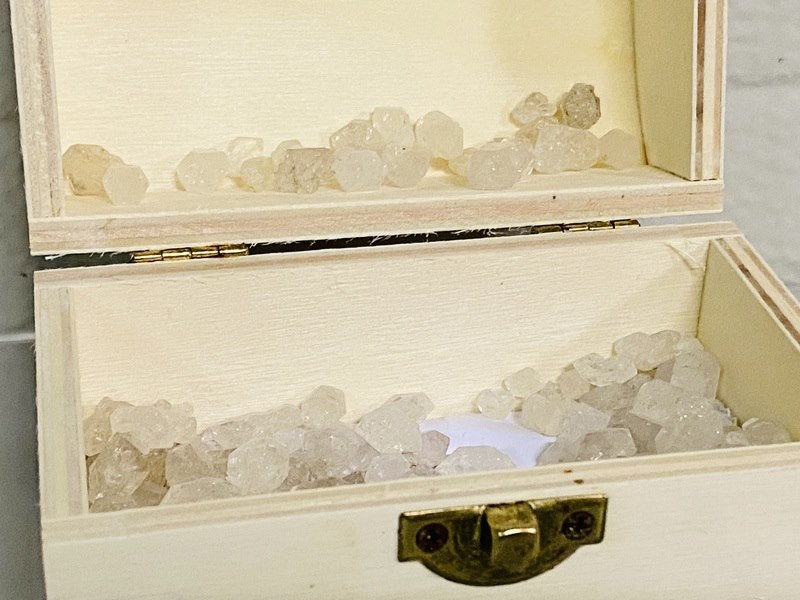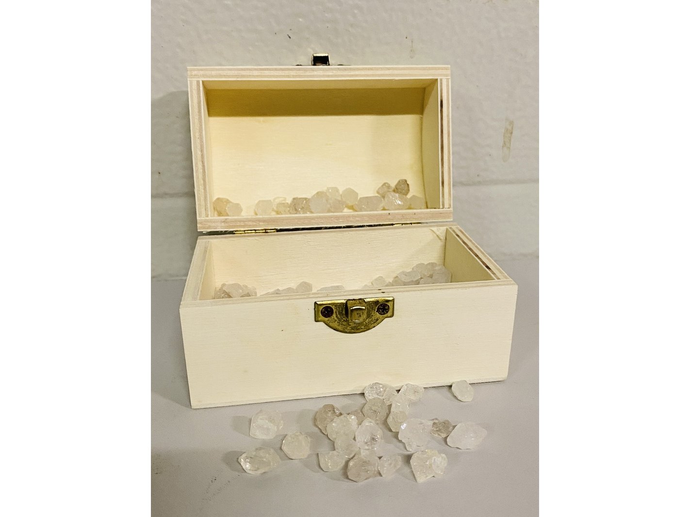 Product: Herkimer diamonds Materiaal: Edelsteen Conditie: nieuw Specificaties: 200 Herkimer diamonds (dubbeleinders) in houten kistje