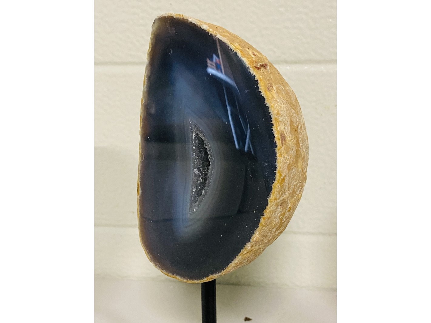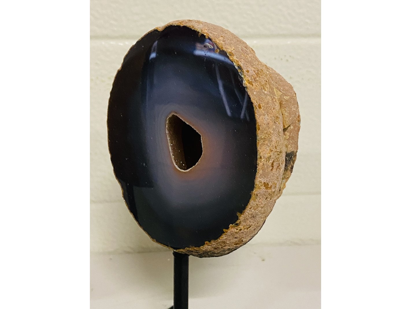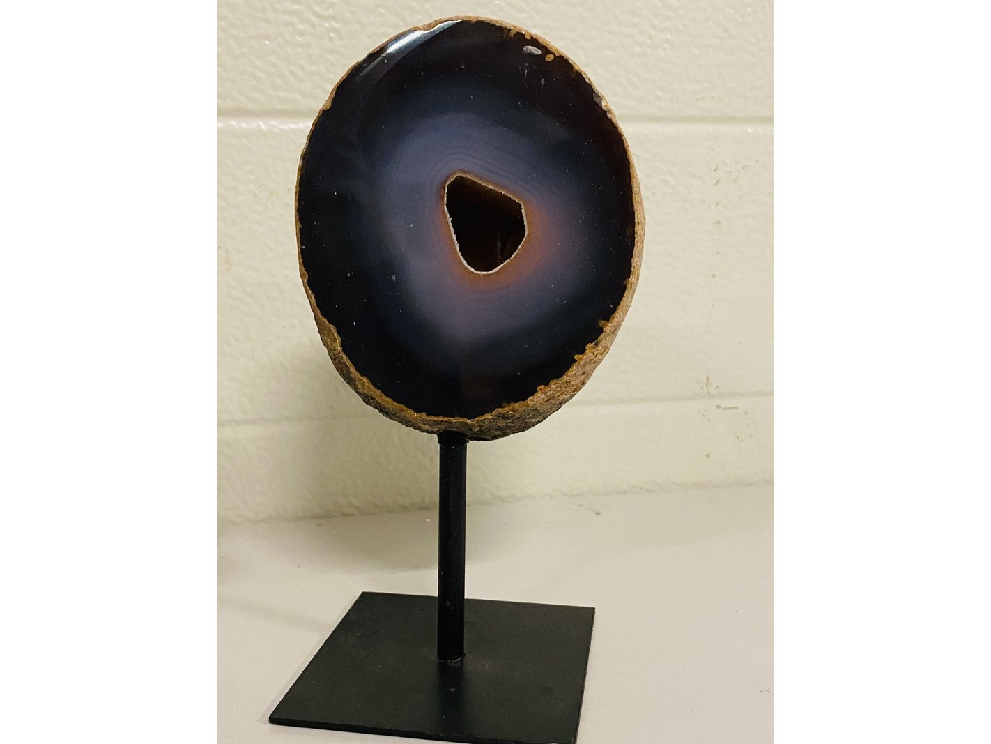 Product: Agaat/Chalcedoon op standaard Materiaal: Fossiel Afmeting: ca 2230 gram; 18-20cm hoog Conditie: nieuw Specificaties: 2 Agaat/Chalcedoon plakken op metalen standaard uit Brazilië