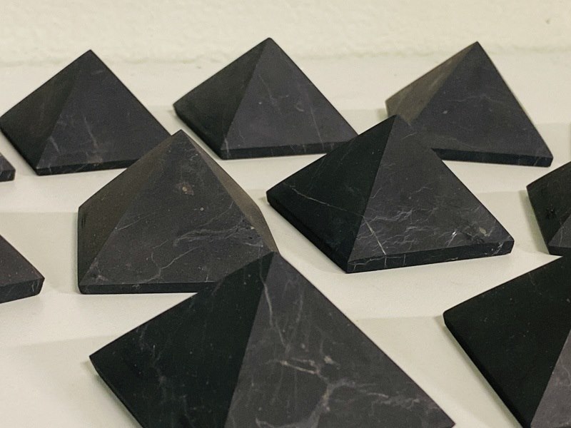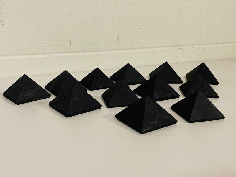 Product: Shungiet piramide ongepolijst Materiaal: Edelsteen Afmeting: ca 5 x 5 x 5 cm Conditie: nieuw Specificaties: 12 ongepolijste Shungiet piramides. Komen uit Rusland