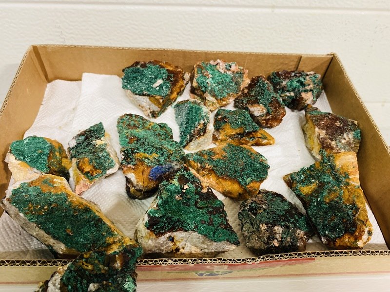 Product: Azuriet / Malachiet brokjes Materiaal: Edelsteen Afmeting: ca 3 kg; 6 - 10 cm lengte Conditie: nieuw Specificaties: Tray met Azuriet/Malachiet brokjes uit Marokko
