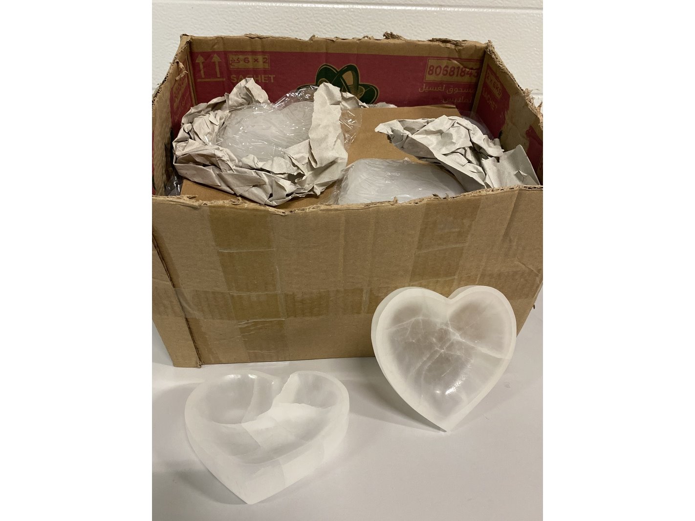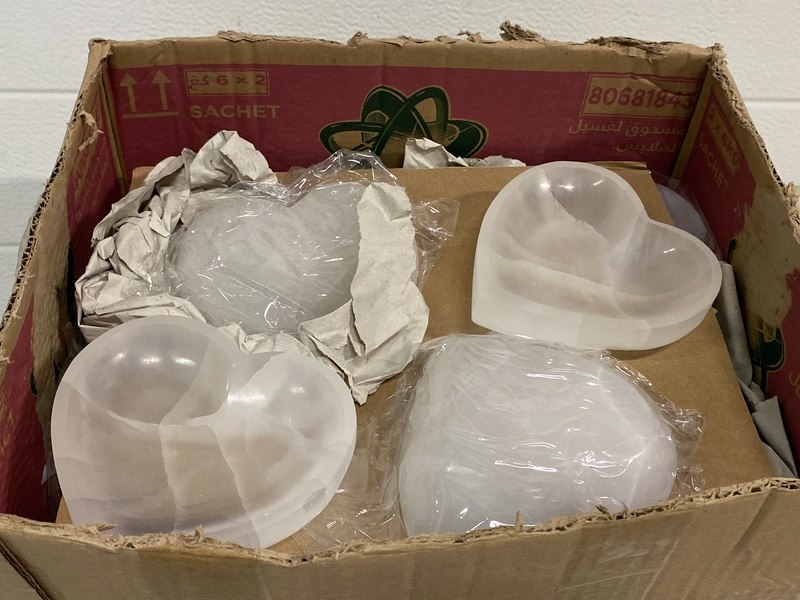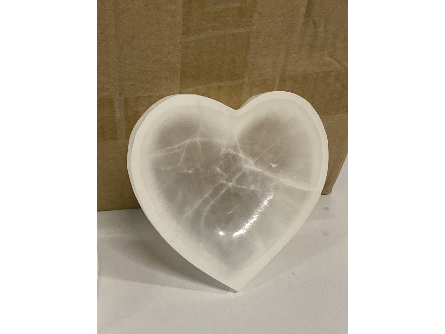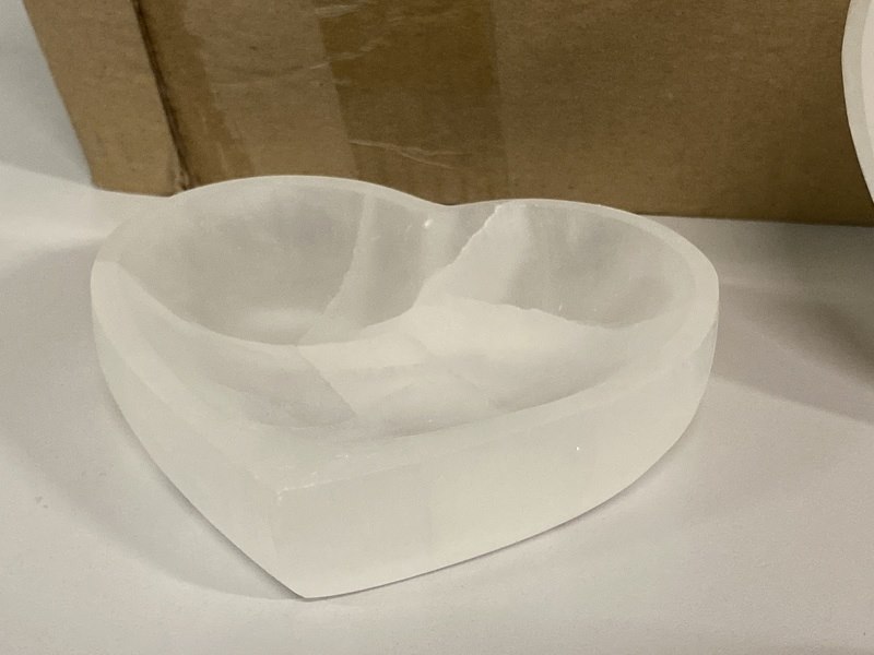 Product: Seleniet schalen hartvorm Kleur: Wit Materiaal: Edelsteen Afmeting: Ø ca 14 cm Conditie: nieuw Specificaties: 20 Seleniet hartvorm schalen met een doorsnee van 14 cm. Komt uit Marokko.