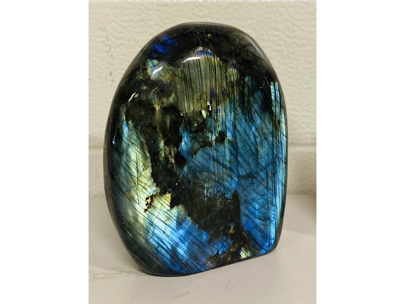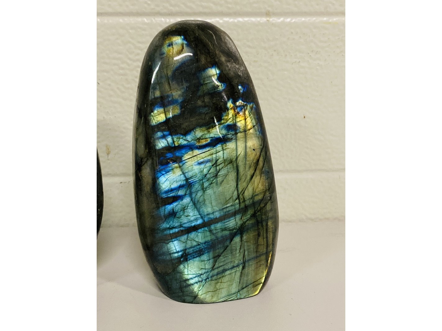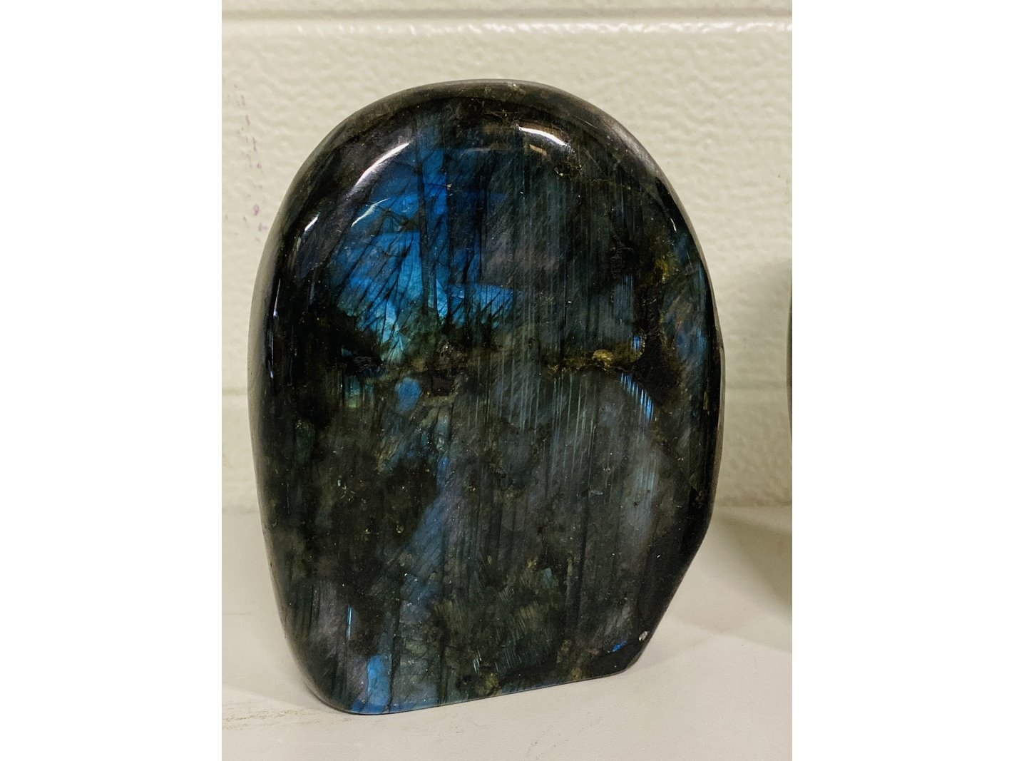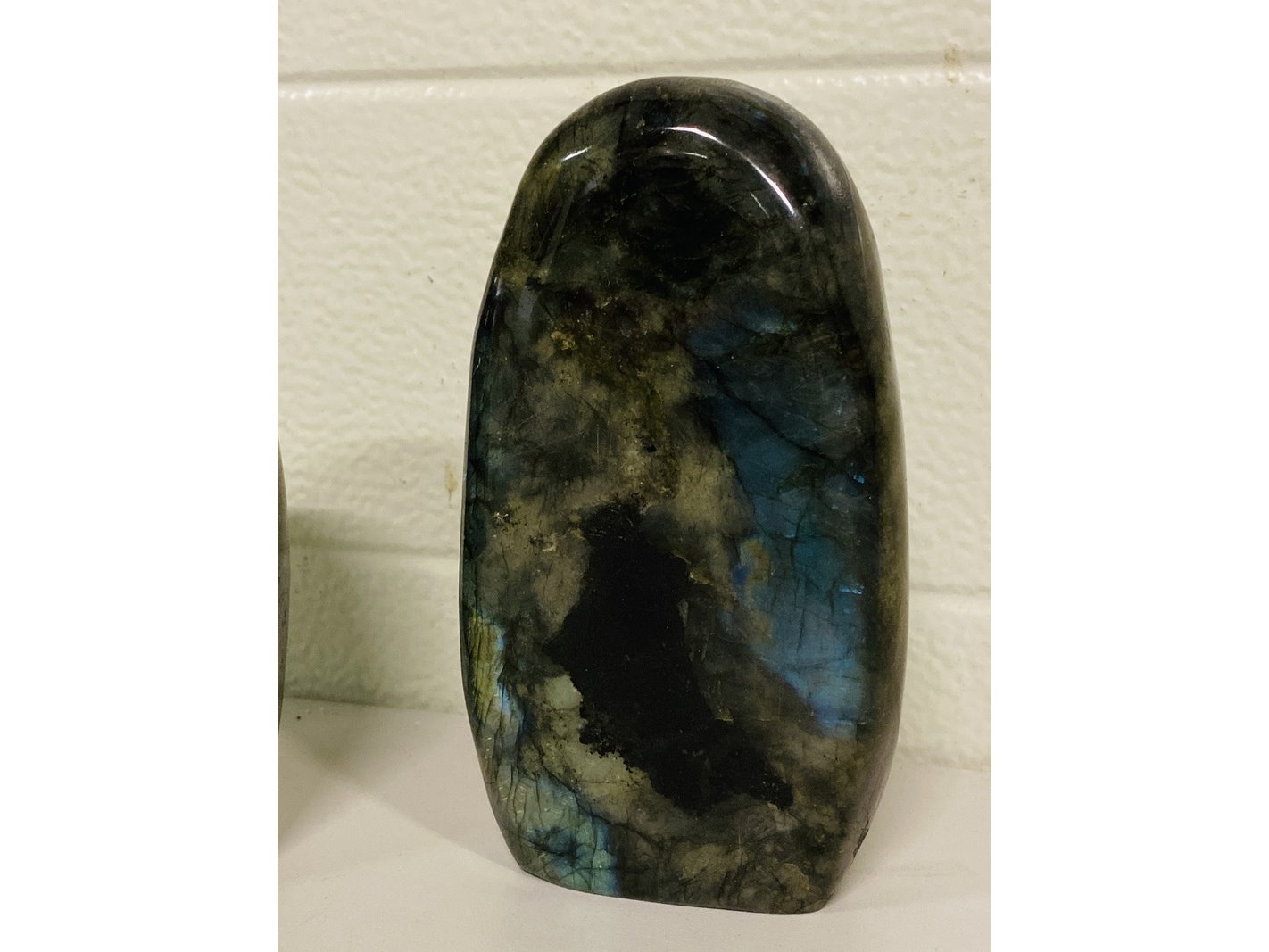 Product: Labradoriet gepolijste vrije vormen Materiaal: Edelsteen Afmeting: ca 2700 gram, 14 - 16 cm hoogte Conditie: nieuw Specificaties: 2 Labradoriet gepolijste freeform sculptuur met mooie vlam.