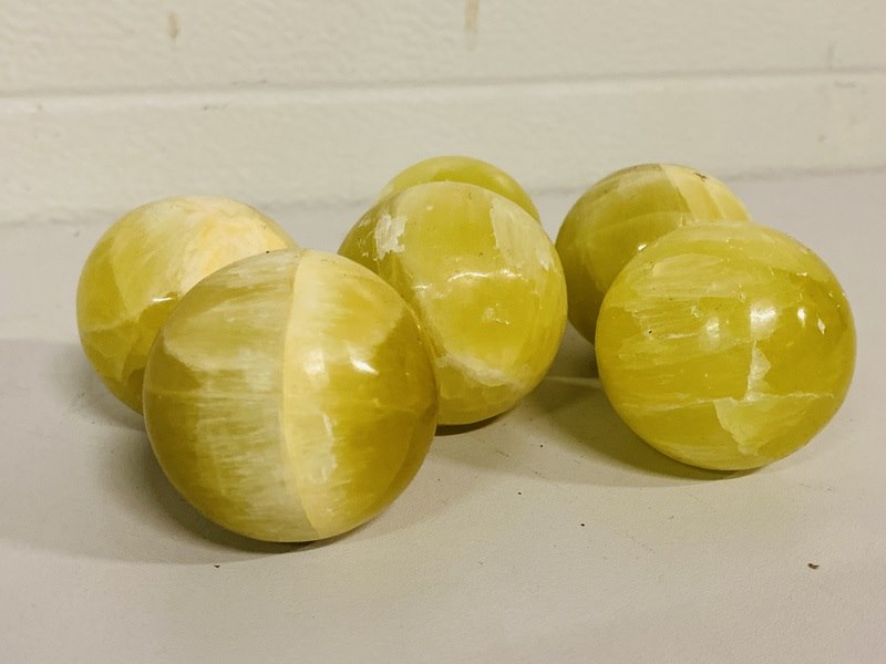 Product: Citroencalciet bol Materiaal: Edelsteen Afmeting: ca 953 gram, ca 4,5 - 5 cm doorsnee Conditie: nieuw Specificaties: 6 bollen van Citroencalciet. Vindplaats is Pakistan