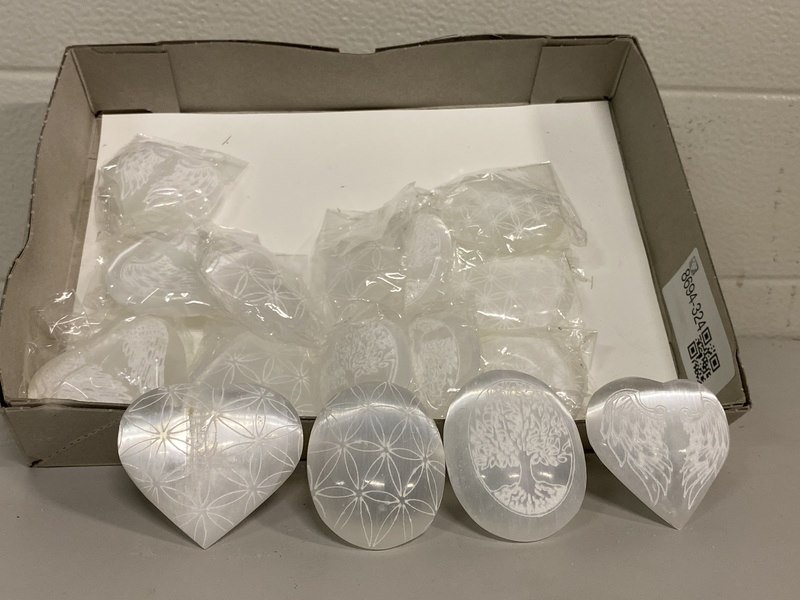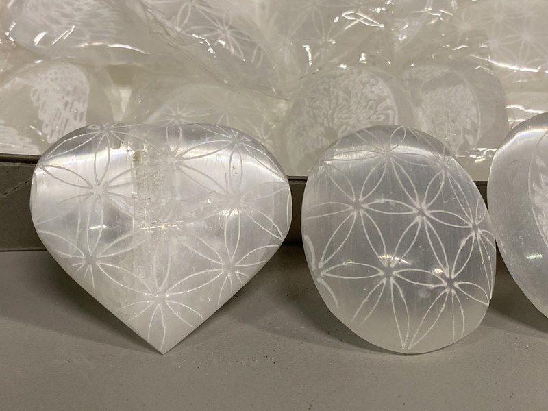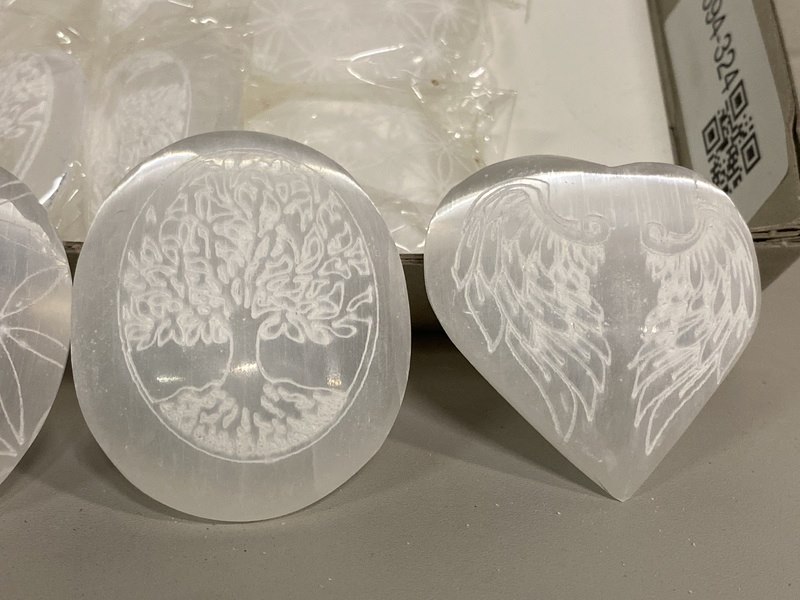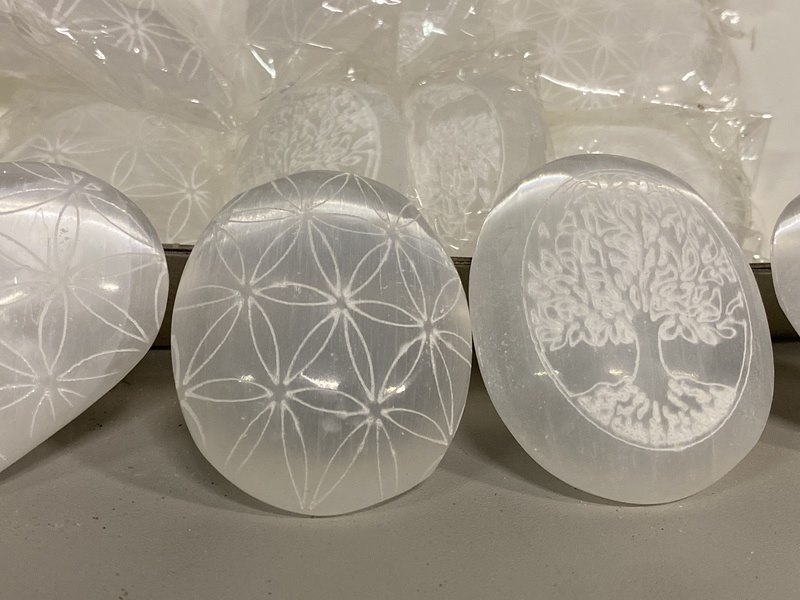 Product: Seleniet gegraveerd Kleur: Wit Materiaal: Edelsteen Afmeting: ca Ø 7 cm doorsnee Conditie: nieuw Specificaties: 16 stuks gegraveerde Seleniet met Tree of Life, Flowers en Wings afbeeldingen