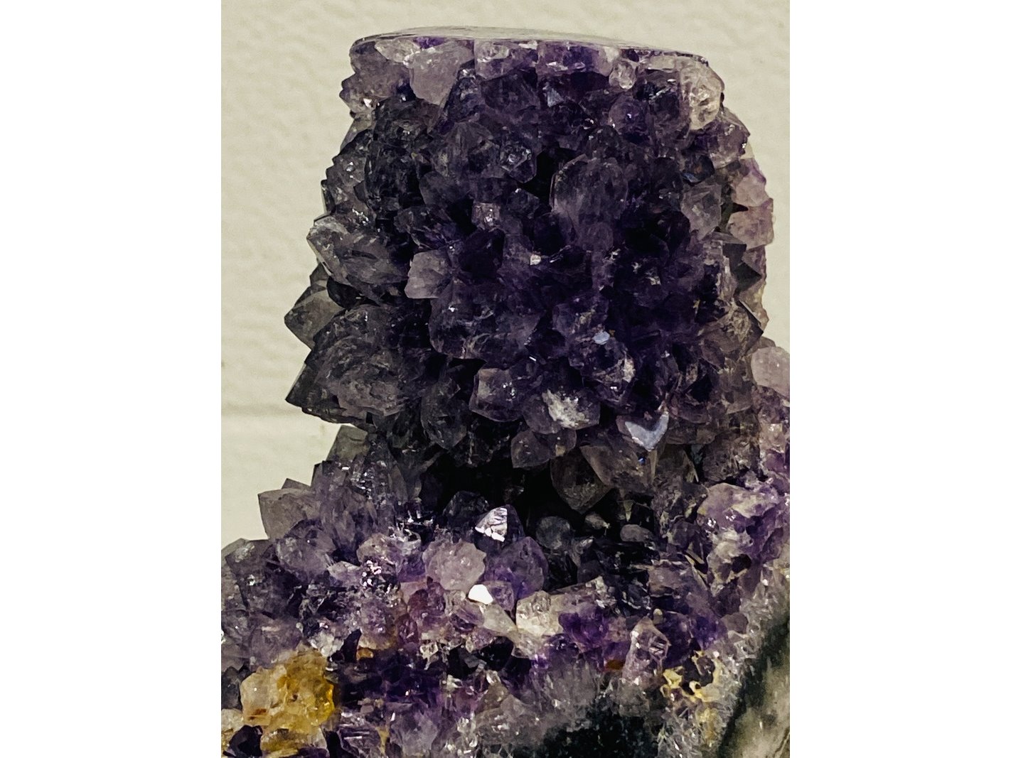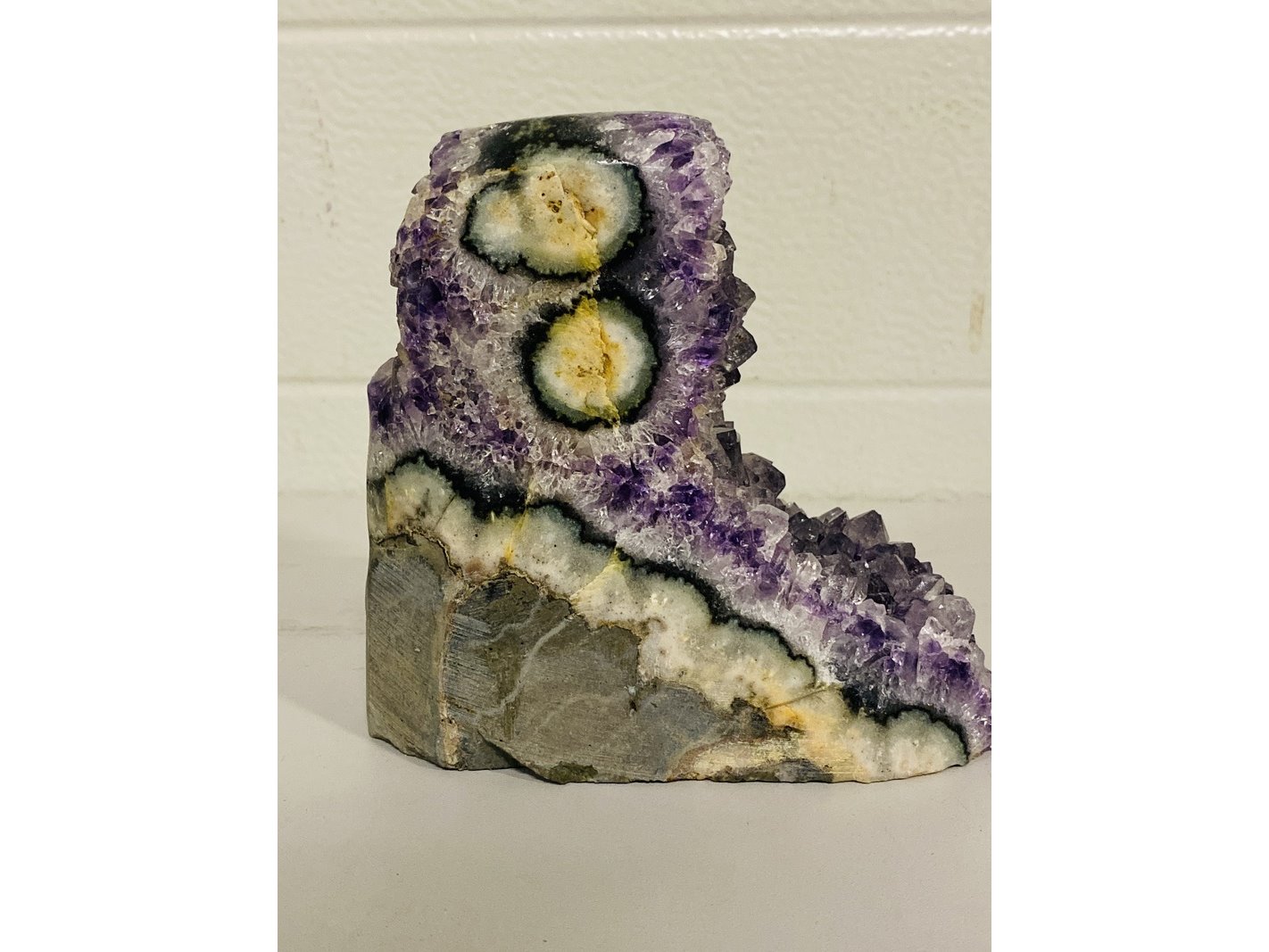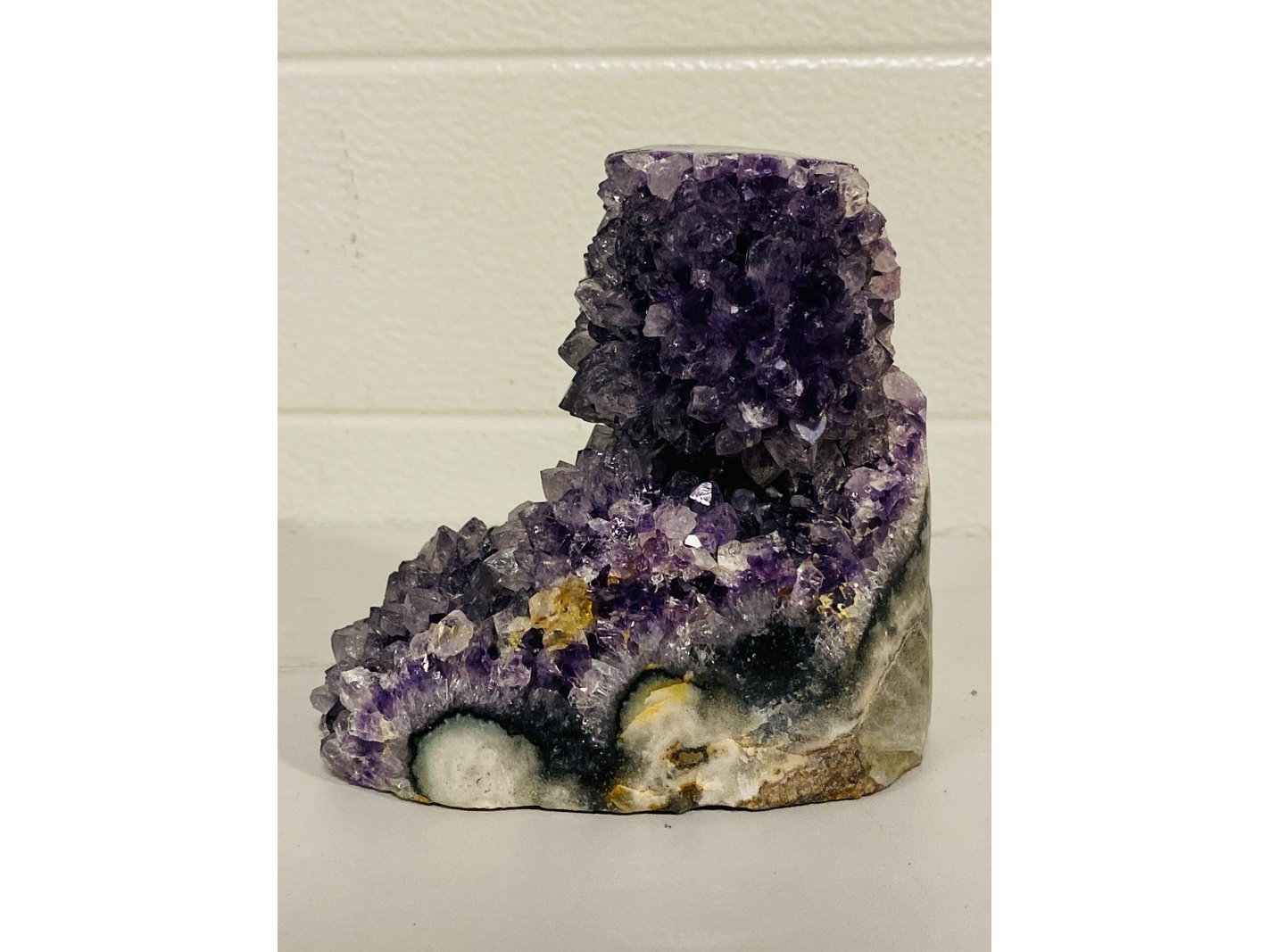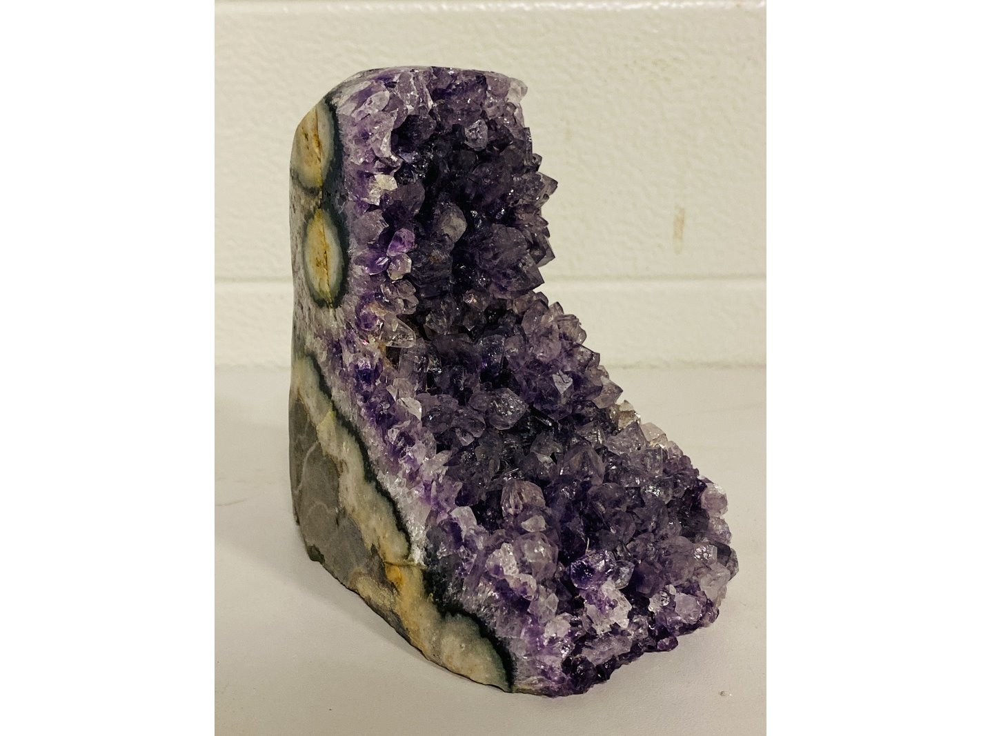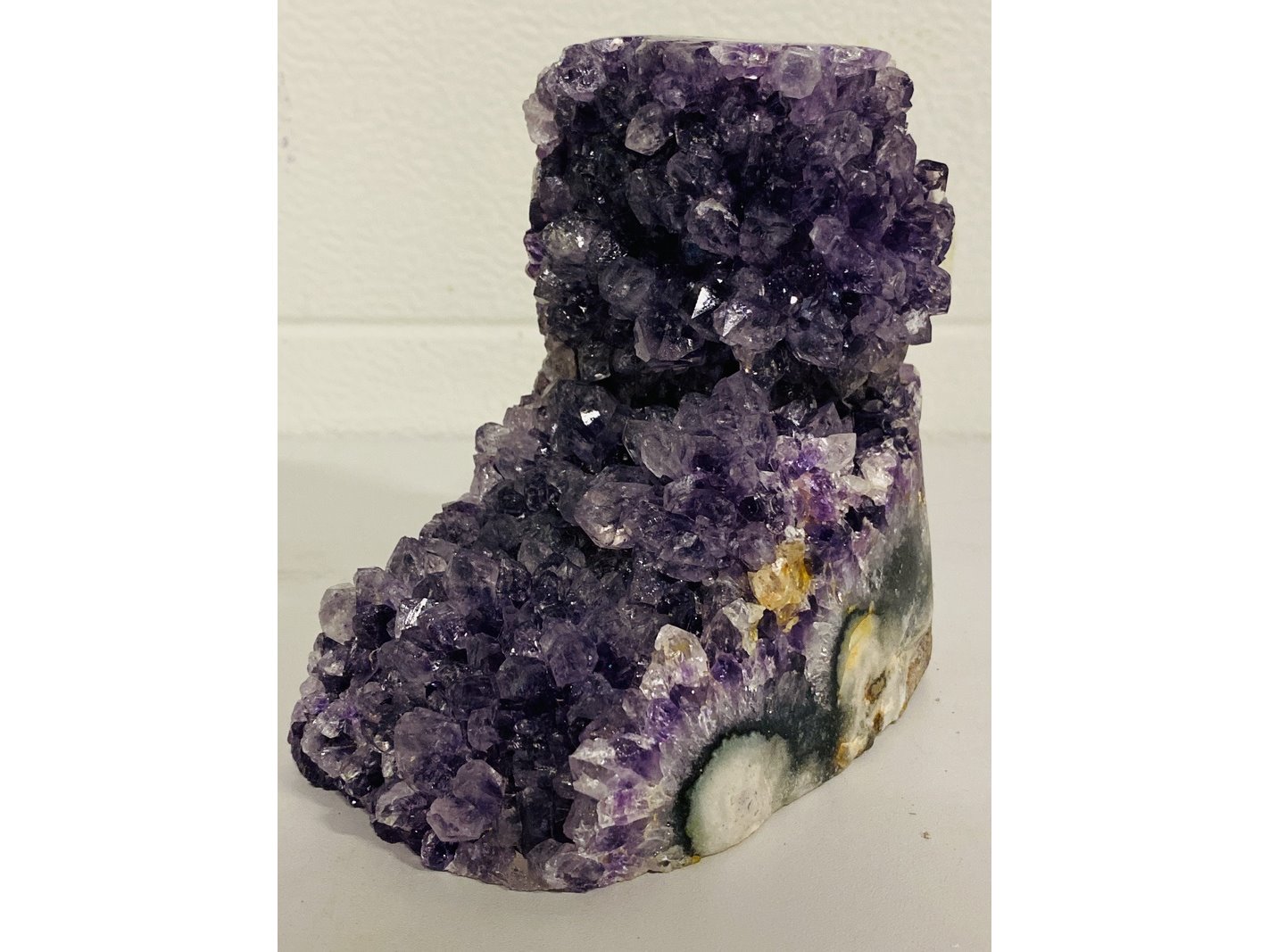 Product: Amethist met gepolijste randen (Uru) Kleur: Paars Materiaal: Edelsteen Afmeting: ca 1992 gram, 9 x 13 x 14 cm Conditie: nieuw Specificaties: 1 Amethist druse. Vindplaats Uruguay