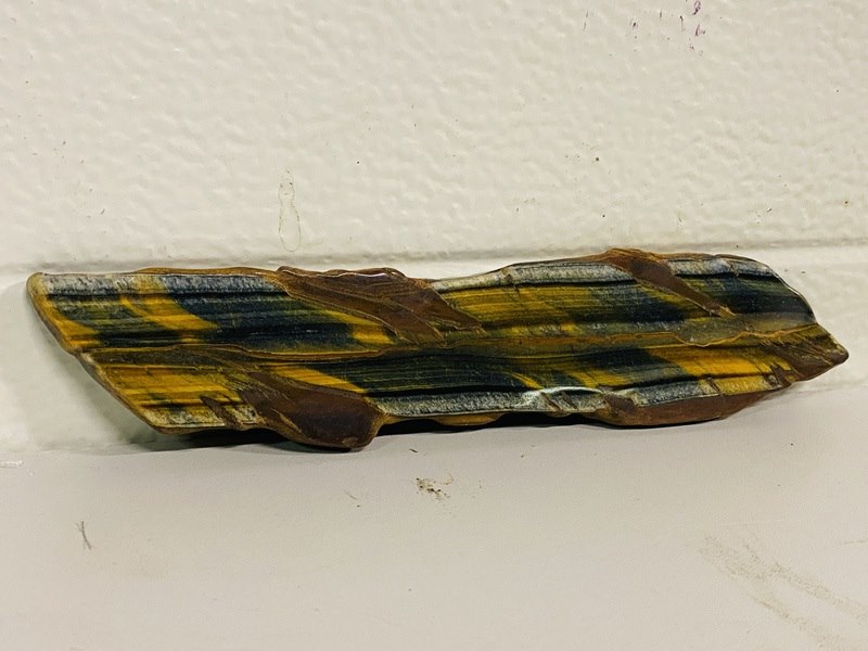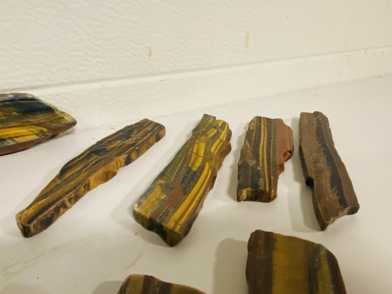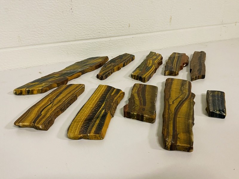 Product: Tijgeroog / Valkenoog gepolijst Materiaal: Edelsteen Afmeting: ca 1100 gram; 6 - 21 cm lengte Conditie: nieuw Specificaties: 10 gepolijste plakken van Tijgeroog/Valkenoog uit China