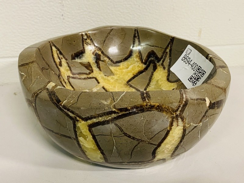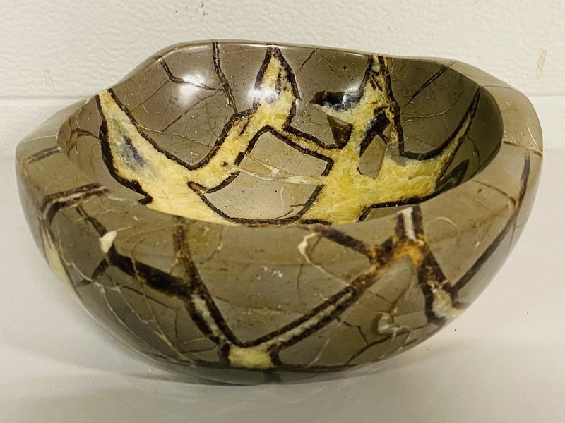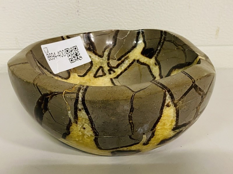 Product: Septariekwarts schaal Materiaal: Edelsteen Afmeting: ca 23cm diameter, 10 cm hoog Conditie: nieuw Specificaties: 1 grote schaal van Septariekwarts uit Madagaskar, ca. 5,45 kg