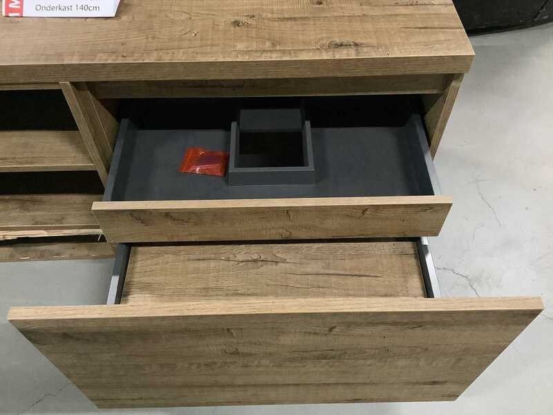 Merk: Primabad Product: Onderkast met afdekblad 140 cm breed Materiaal: Mdf Afmeting: 140x50 cm Conditie: Showmodel Specificaties: Onderkast bestaat uit 2 blokken. 2 soft close lades.