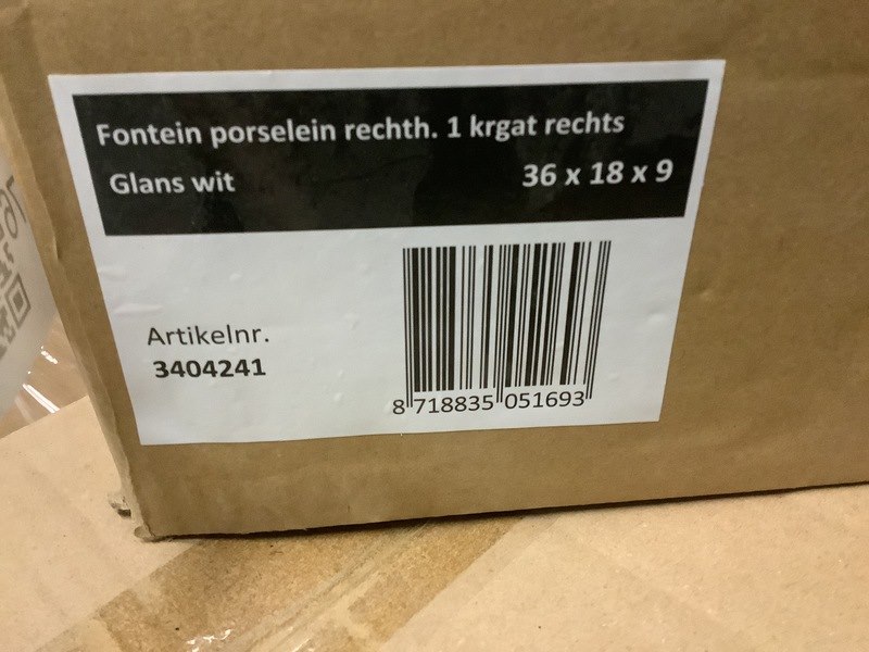 Product: Fontein 36x18x9 cm Kleur: wit Conditie: Nieuw Specificaties: rechth.1x krgat R./ rechth. 0/ktgt rechts