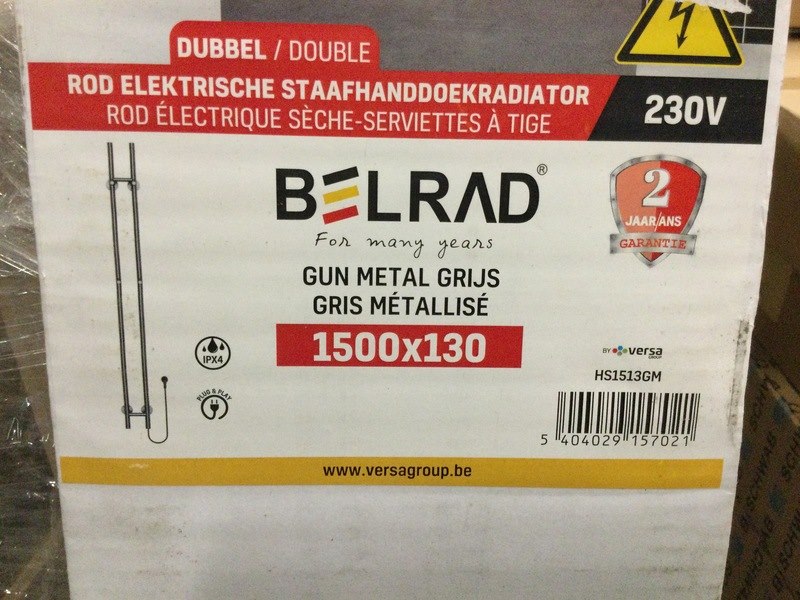Merk: Belrad Product: Radiator staafmodel badkamer Kleur: gynmetal Afmeting: 150x16,8x12,7 cm Conditie: Nieuw Specificaties: Dubbel, elektrisch, 120 Watt