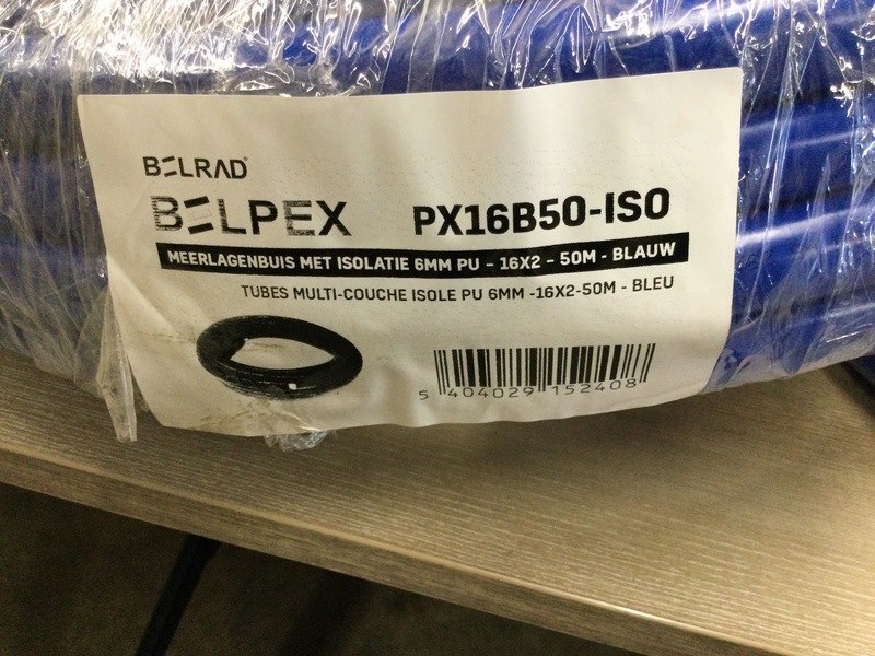 Merk: Belrad Belpex Product: Meerlagenbuis met mantel Kleur: blauw Afmeting: 50 meter 16x2 Conditie: Nieuw Specificaties: Isolatie 6 mm PU