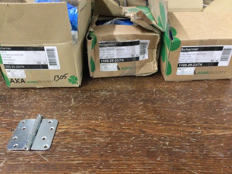 Merk: Axa Product: 150 scharnieren Materiaal: Metaal Afmeting: 89x89 mm Conditie: Nieuw Specificaties: 3 dozen van 50 stuks