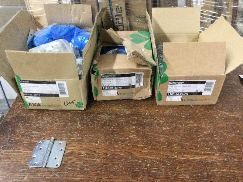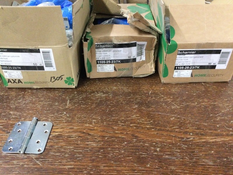 Merk: Axa Product: 150 scharnieren Materiaal: Metaal Afmeting: 89x89 mm Conditie: Nieuw Specificaties: 3 dozen van 50 stuks