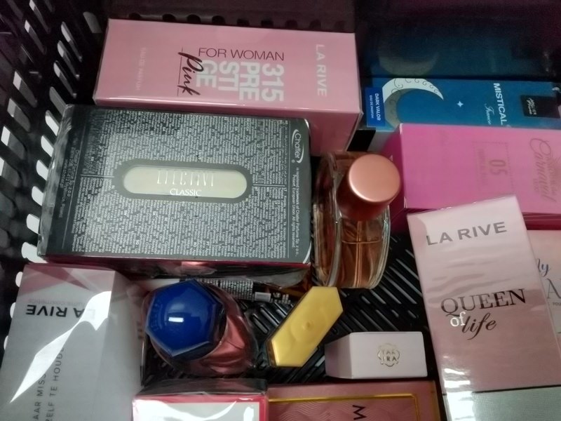 Volle krat met diverse soorten parfums