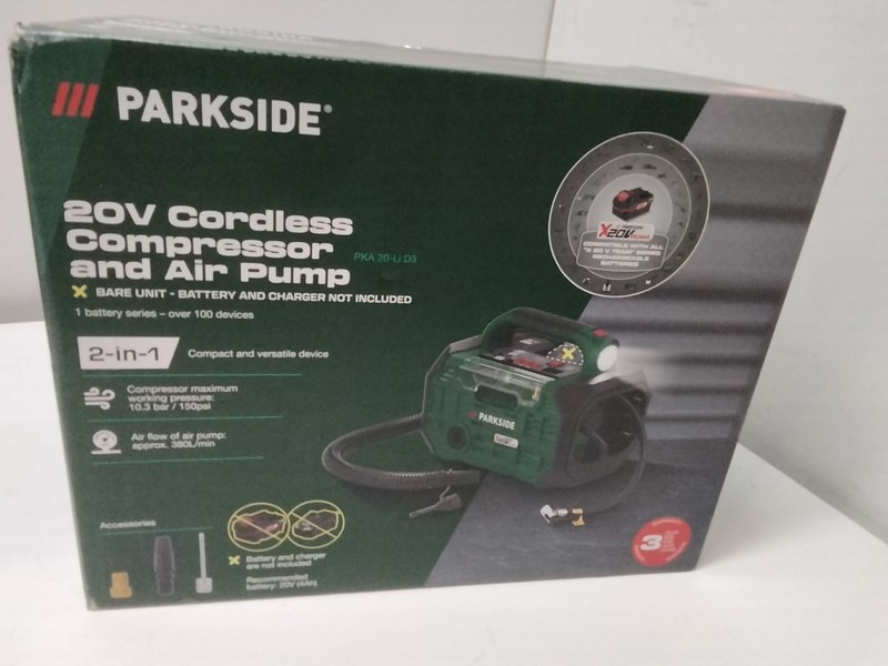 Merk: Parkside Product: Draadloze compressor en luchtpomp excl. accu Conditie: Nieuw Specificaties: Zonder accu