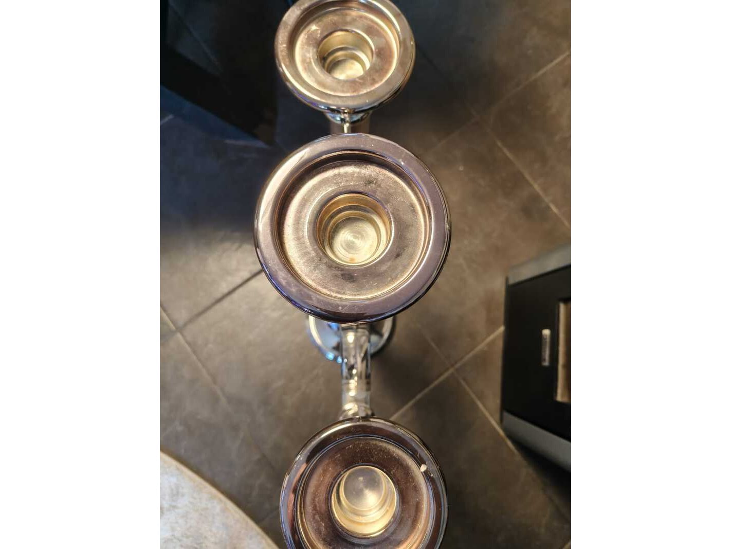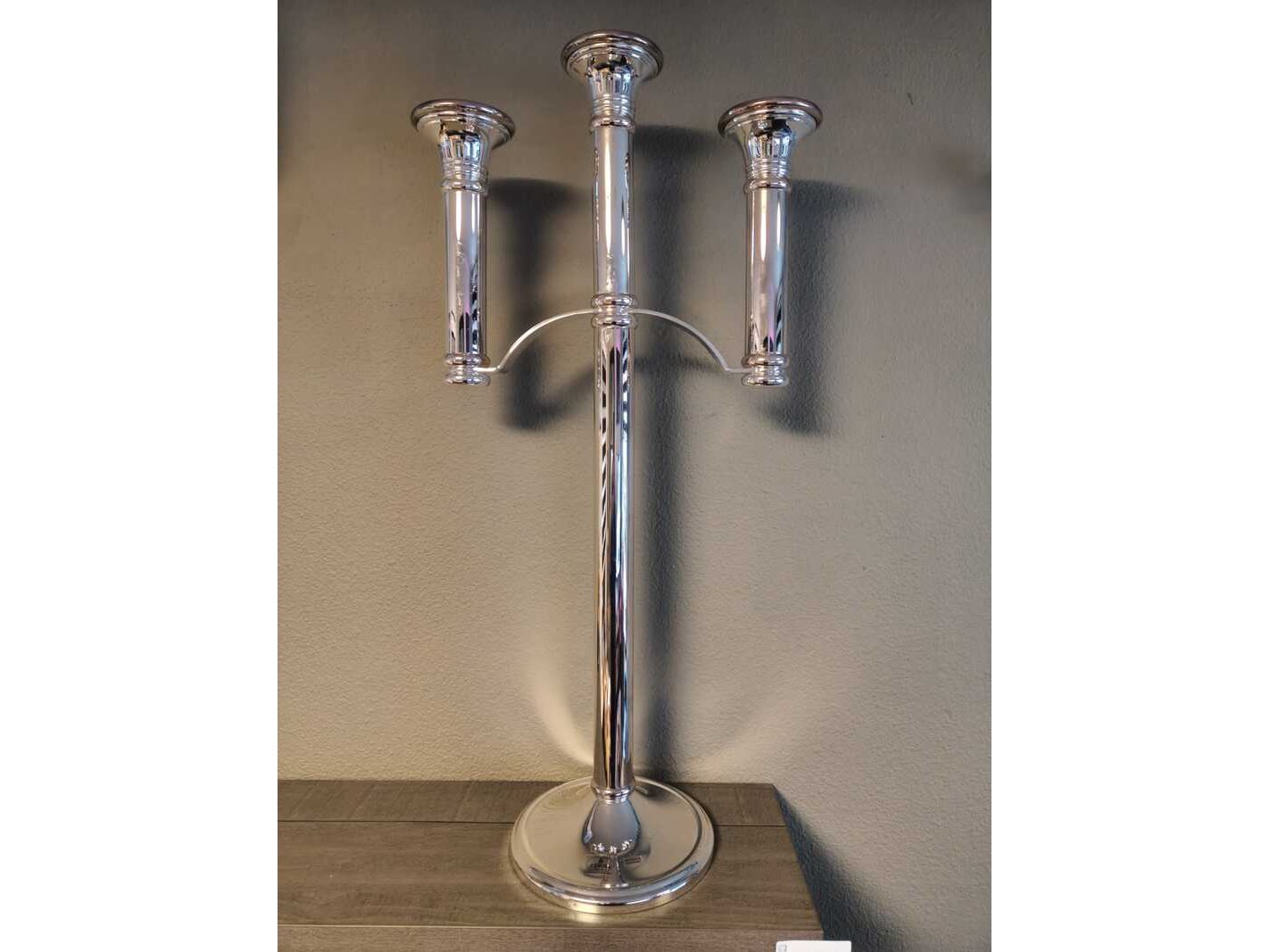 Merk: Fink Silber Product: Grote exclusieve verzilverde kandelaar Kleur: zilver Afmeting: Hoogte 85, breedte 41 cm Conditie: Nieuw Specificaties: In de voet ingeslagen merknaam Fink. Beslist origineel Met 3 koppen