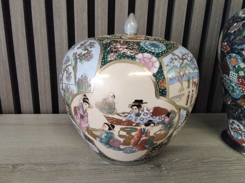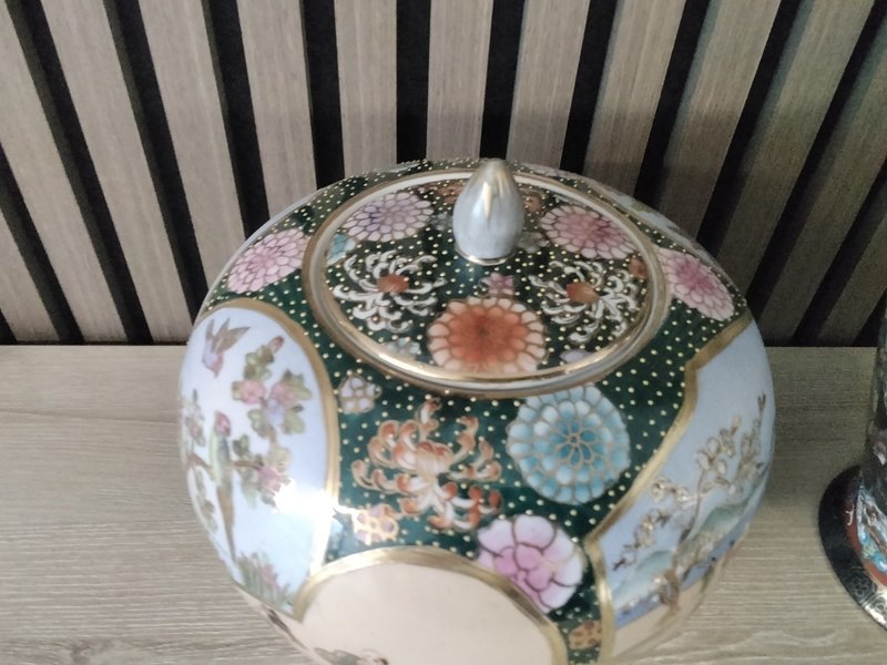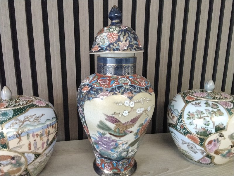 Product: Chinese vazen Conditie: Nieuw Specificaties: Afm. 2x 21 cm hoog, 20 cm breed. 1x 36 cm hoog, 17 cm breed. Deksel vd hoge past niet fijn.