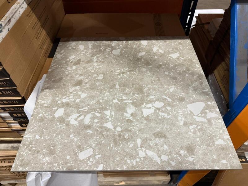 Product: Keramische Terrazzo look 60x60 28,8 m2 Afmeting: 60x60x0,9 cm Conditie: Nieuw Specificaties: • Afmeting: 60x60 cm • Dikte: 0,9 cm • Kwaliteit: A • Geschikt voor: wand en vloer • Verpakking: 28,80 m2