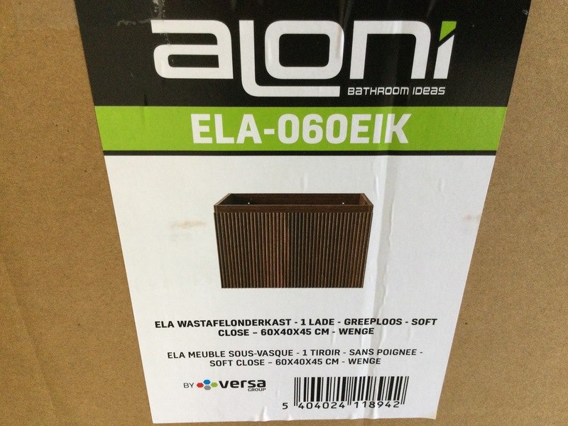 Merk: Aloni Product: Wastafelonderkast badkamer Kleur: wenge Afmeting: 60x40x45 cm Conditie: Nieuw Specificaties: Greeploos, 1x soft close lade