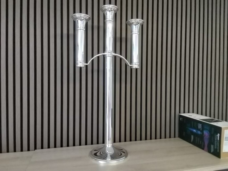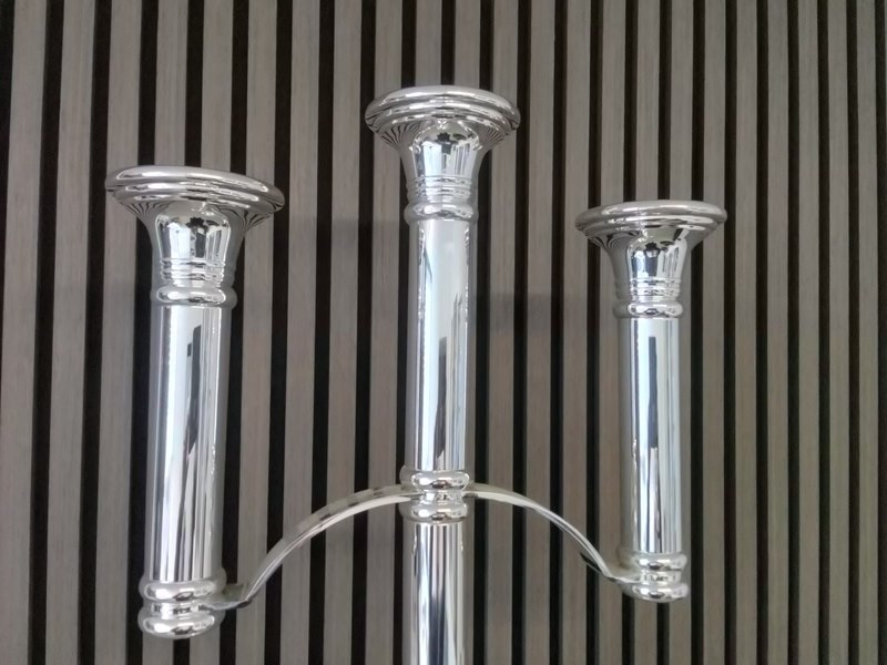Merk: Fink Silber Product: 3 Koppige verzilverde kandelaar Afmeting: 86 cm hoog, 40 cm breed Conditie: Nieuw