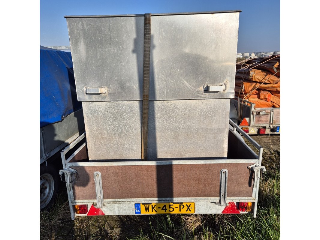 Merk: Vawe Product: Aanhangwagen met bak en olieschermen Afmeting: LxB ca. 420 x 205 cm. Conditie: gebruikt Specificaties: Kenteken: WK-45-PX VIN nummer: onbekend Eerste toelating nationaal: 22-10-1993 Massa ledig voertuig: 400 kg Laadvermogen: 1600 kg Opties e.d. Waargenomen gebreken: Gebruikssporen rondom Deuken in spatboard Technische staat en werking onbekend. De aangegeven lengte is de afstand van hart koppeling tot achterzijde van de aanhanger.