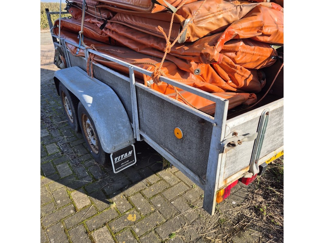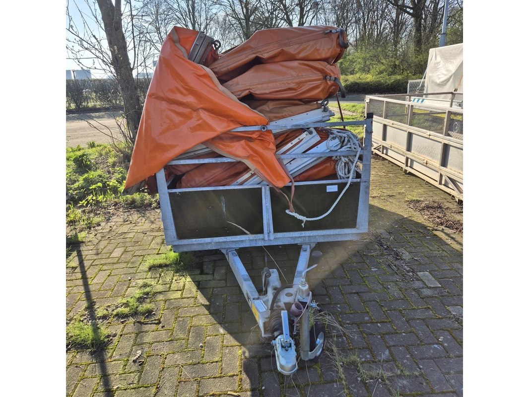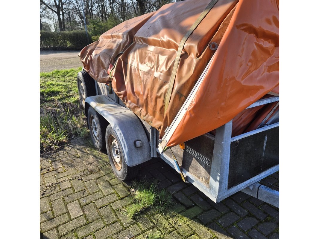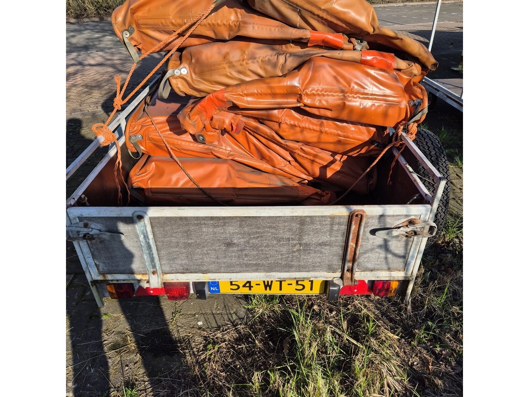 Merk: Vawe Product: Aanhangwagen met olieschermen. Afmeting: LxB ca. 415 x 182 cm. Conditie: gebruikt Specificaties: Kenteken: 54-WT-51 VIN nummer: onbekend Eerste toelating nationaal: 16-08-1988 Massa ledig voertuig: 340 kg Laadvermogen: 1160 kg. Opties e.d. Reservewiel Waargenomen gebreken: Gebruikssporen rondom Deuken in spatbord Technische staat en werking onbekend. De aangegeven lengte is de afstand van hart koppeling tot achterzijde van de aanhanger.