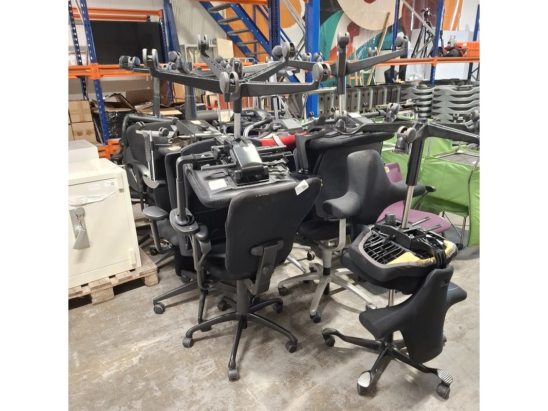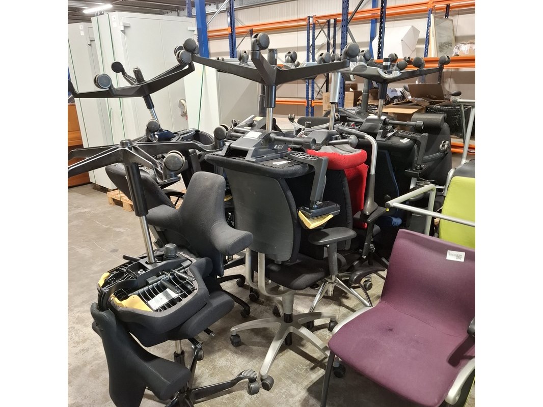 Merk: O.a. Intersthul Product: Bureaustoel Conditie: Gebruikt Specificaties: Bevat diverse gebruikssporen. Diverse soorten en maten. Diverse merken met o.a. Intersthul, haworth en Grahl