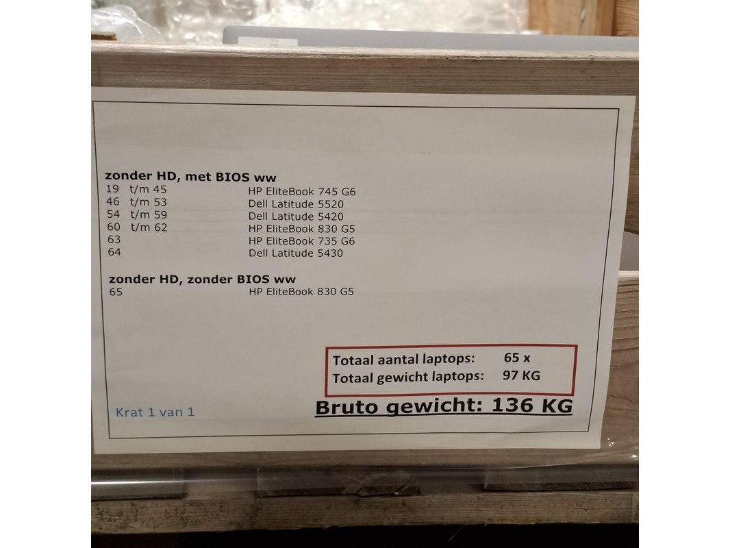 Merk: HP/Dell Product: Laptop Specificaties: Grade B Met HD, zonder Bios WW 1 t/m 11 - HP Elitebook 745 G6 12 t/m 14 - HP Elitebook 830 G5 15 & 16 - HP Elitebook 830 G5 17 - HP Probook 445 G8 18 - HP Elitebook 745 G6 Zonder HD, met Bios WW 19 t/m 45 - HP Elitebook 745 G6 46 t/m 53 - Dell Latitude 5520 54 t/m 59 - Dell Latitude 5420 60 t/m 62 - HP Elitebook 830 G5 63 - HP Elitebook 735 G6 64 - Dell Latitude 5430 Zonder HD, zonder BIos WW 65 - HP Elitebook 830 G5
