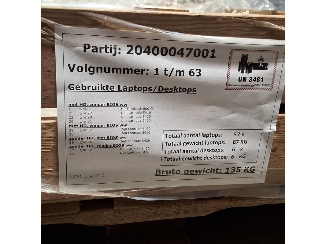 Merk: Dell Product: Laptop Conditie: gebruikt Specificaties: Grade B Met HD, zonder Bios WW 7 t/m 22 - Dell Latitude 5410 23 t/m 28 - Dell Latitude 5420 29 t/m 31 - Dell Latitude 5400 Met HD, zonder Bios WW 32 t/m 37 - Dell Latitude 5420 38 - Dell Latitude 5410 Zonder HD, met Bios WW 39 t/m 56 - Dell Latitude 5420 Zonder HD, zonder Bios WW 57 t/m 62 - Dell Latitude 5420 63 - Dell Latitude 5410