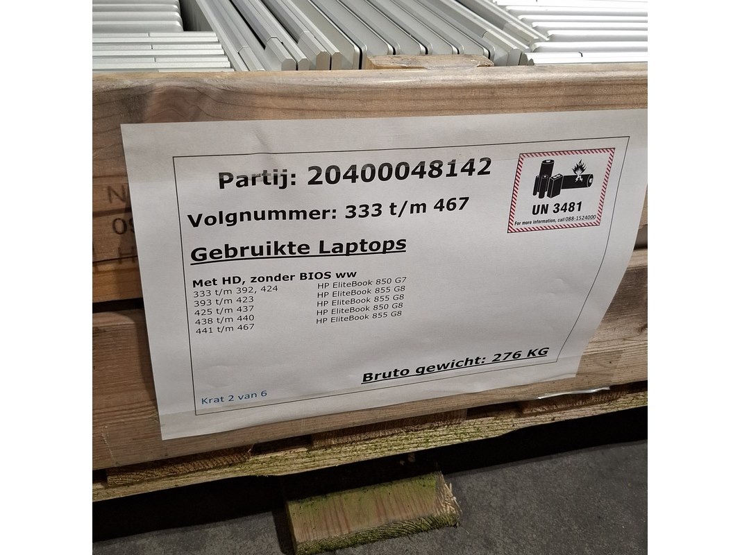 Merk: HP Product: Laptop Specificaties: Grade B Met HD, zonder Bios WW 333 t/m 392, 424 - HP Elitebook 850 G7 393 t/m 423 - HP Elitebook 855 G8 425 t/m 437 - HP Elitebook 855 G8 438 t/m 440 - HP Elitebook 850 G8 441 t/m 467 - HP Elitebook 855 G8
