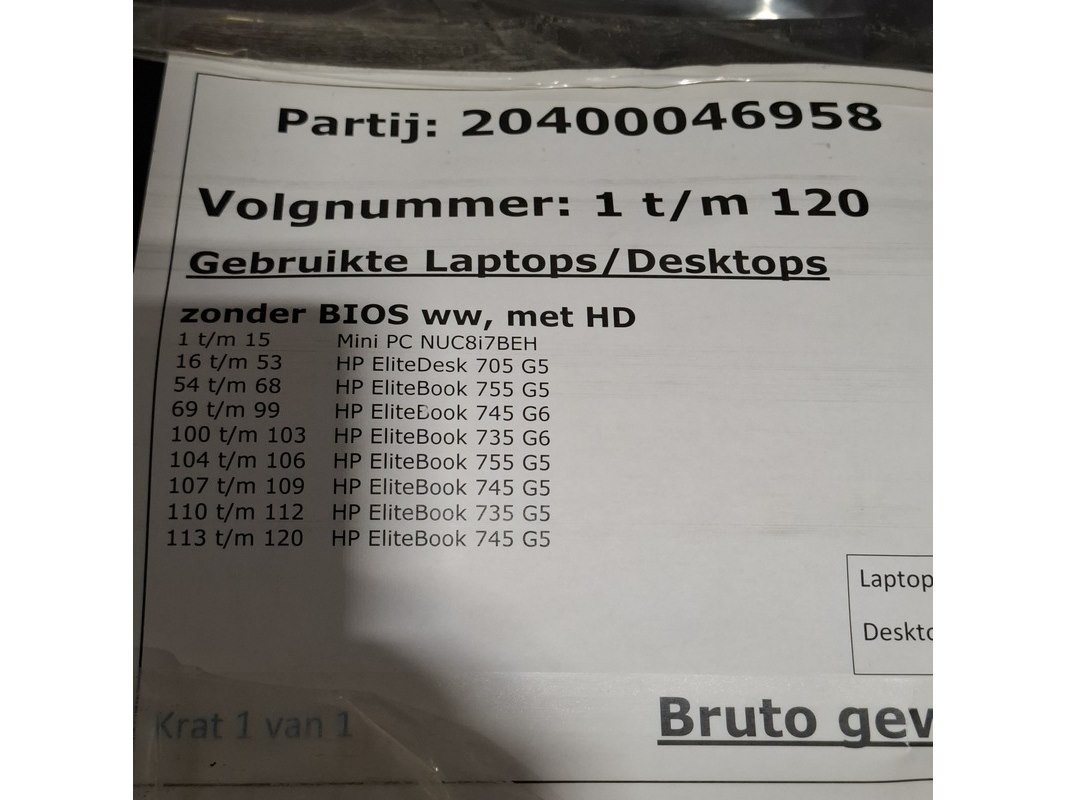 Merk: Dell/HP Product: Desktop Conditie: gebruikt Specificaties: Grade B Zonder Bios WW, met HD 1 t/m 15 - Intel NUC817BEH 16 t/m 53 - HP Elitedesk 705 G5