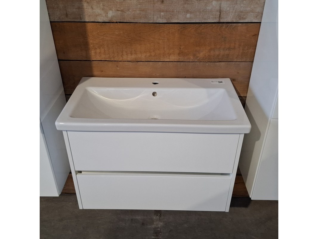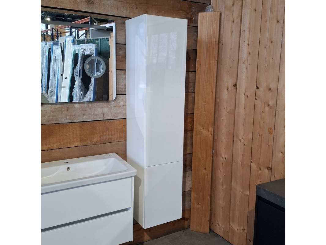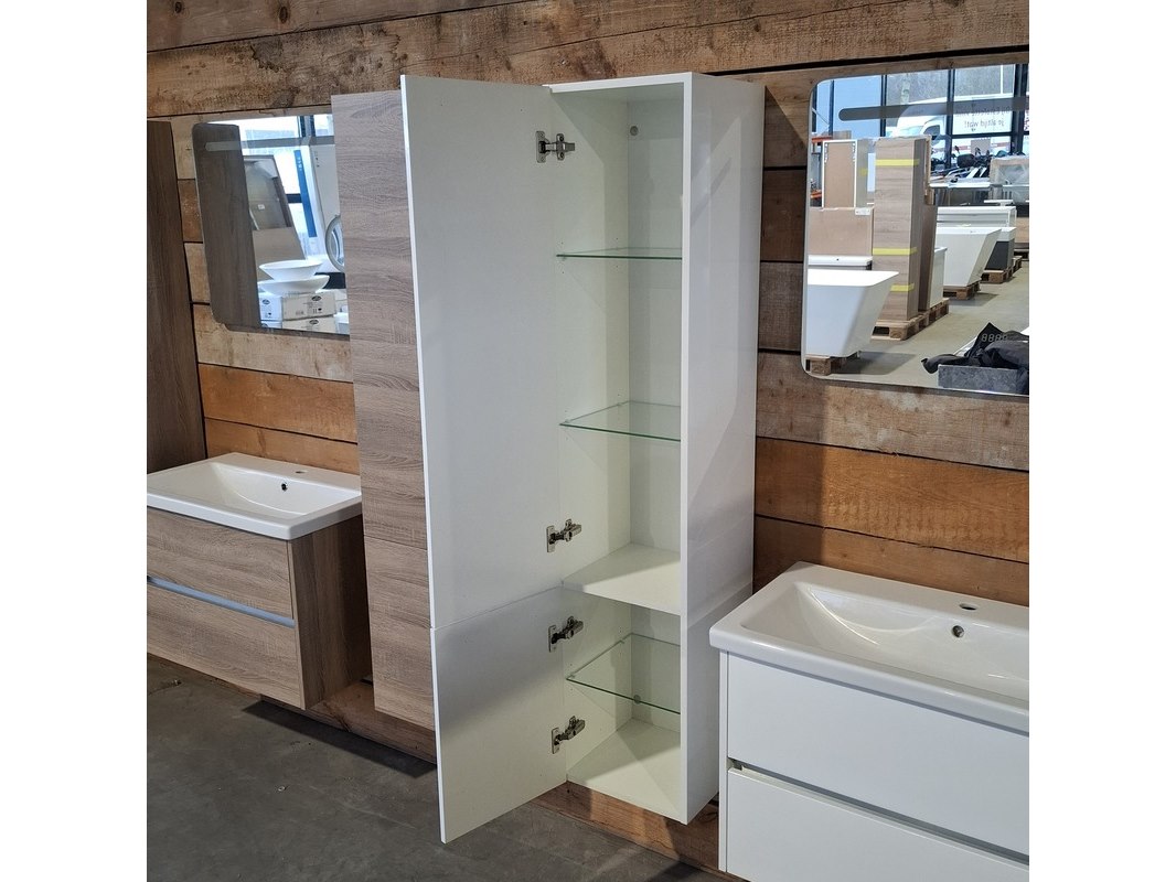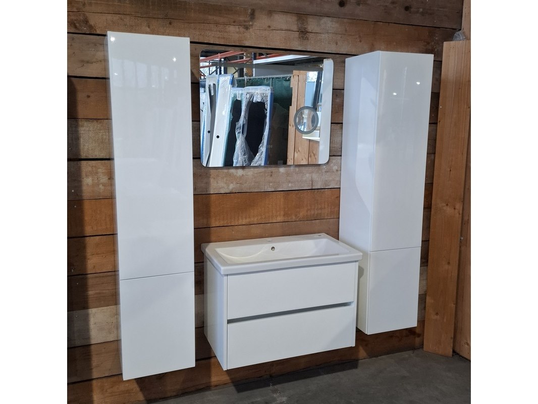 Merk: HR Badmeubelen Product: Badmeubel Kleur: Glans wit Afmeting: 80x46cm Specificaties: 2 lades met softclose, greeploos, keramische wastafel, 1 kraangat, glans wit, spiegel, 80x60cm, met LED verlichting, met scheerspiegel, met LED, 2x bediening, 2x hoge kast, 1x links, 1x rechts, 160x35x35cm, 2 deurtjes met softclose