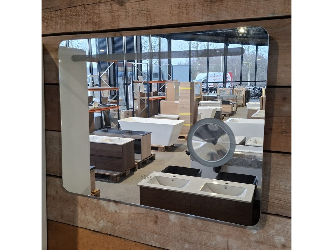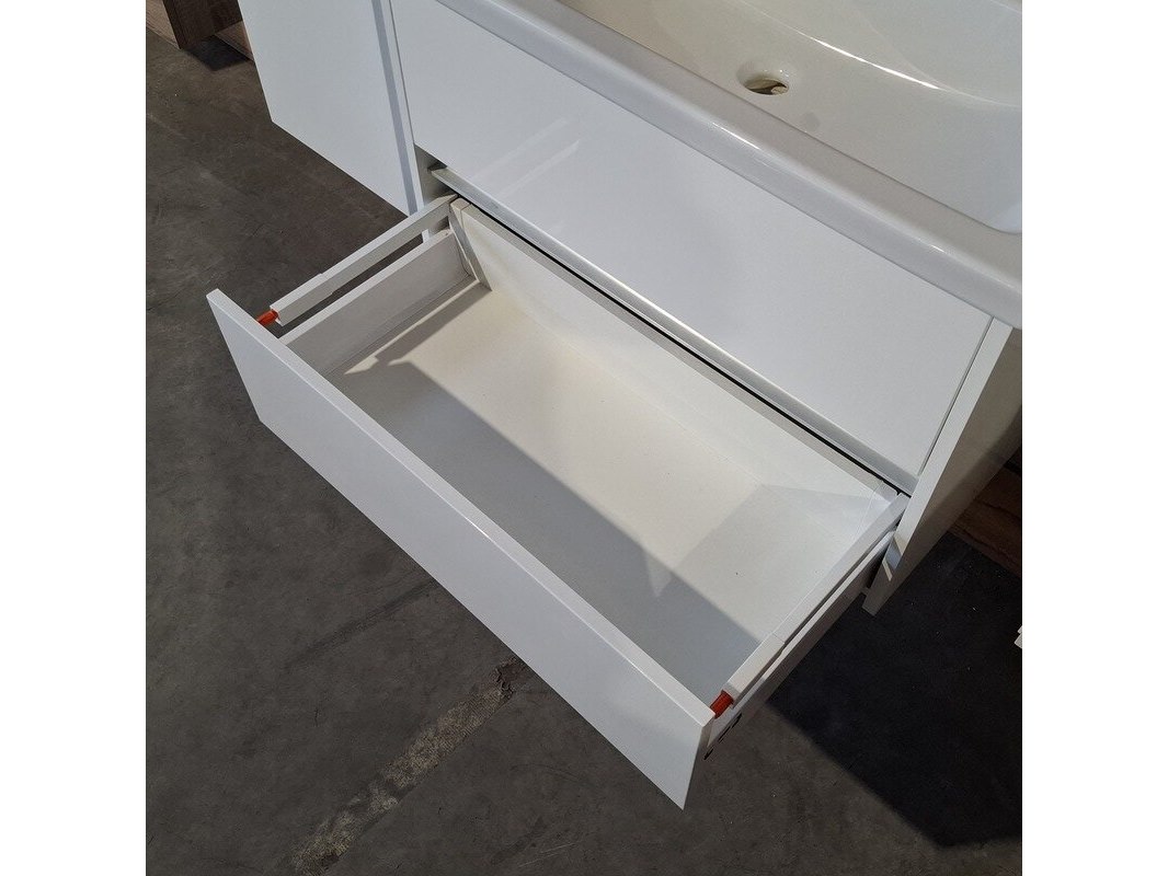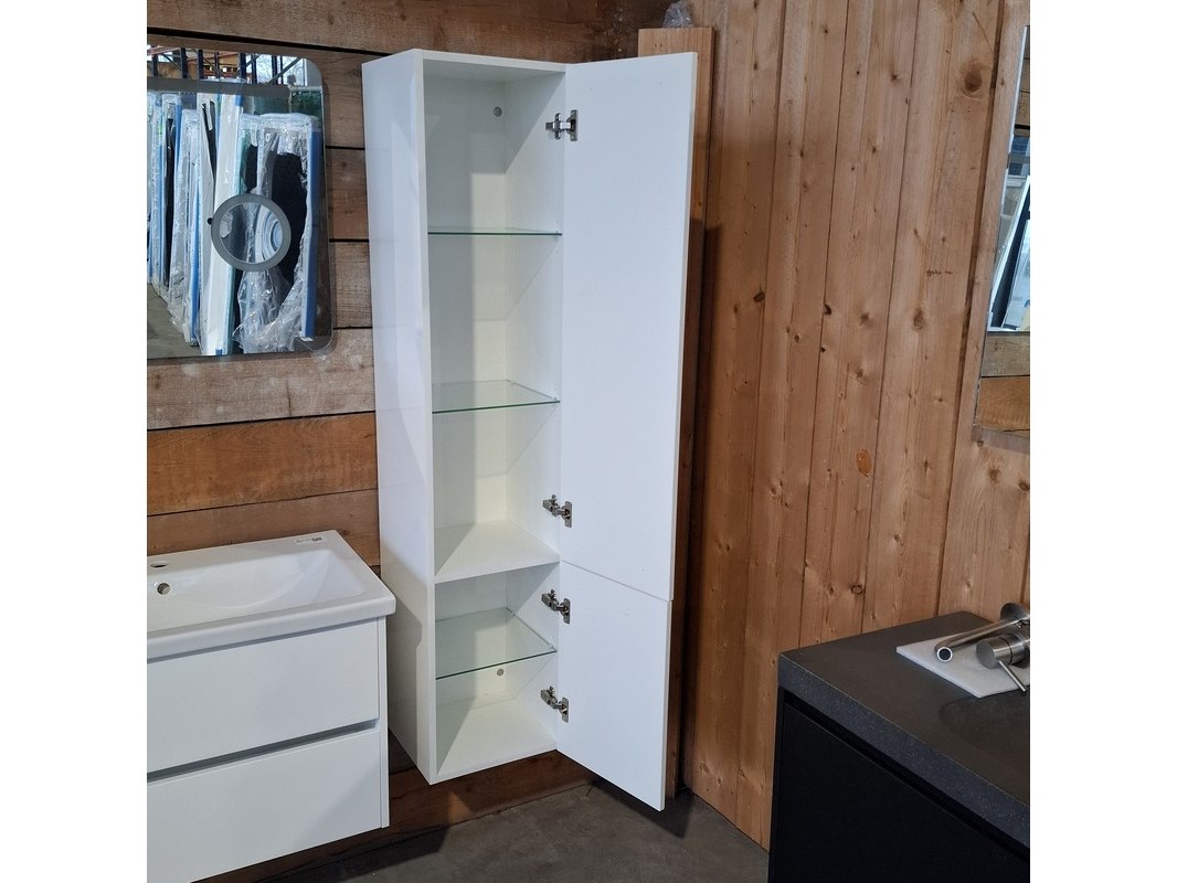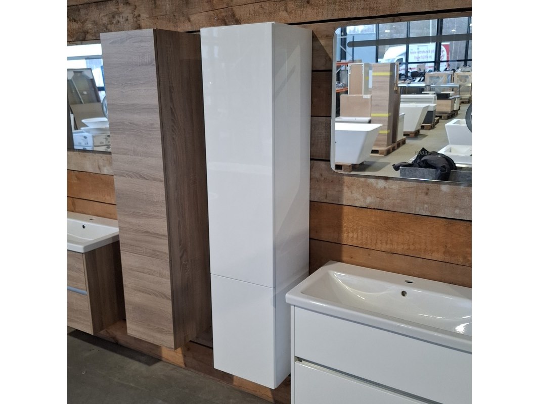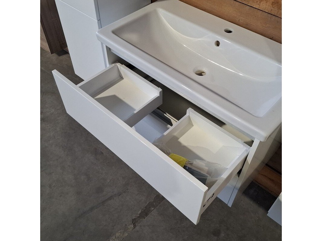 Merk: HR Badmeubelen Product: Badmeubel Kleur: Glans wit Afmeting: 80x46cm Specificaties: 2 lades met softclose, greeploos, keramische wastafel, 1 kraangat, glans wit, spiegel, 80x60cm, met LED verlichting, met scheerspiegel, met LED, 2x bediening, 2x hoge kast, 1x links, 1x rechts, 160x35x35cm, 2 deurtjes met softclose
