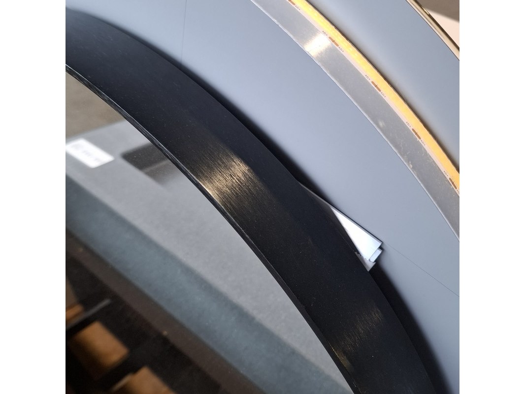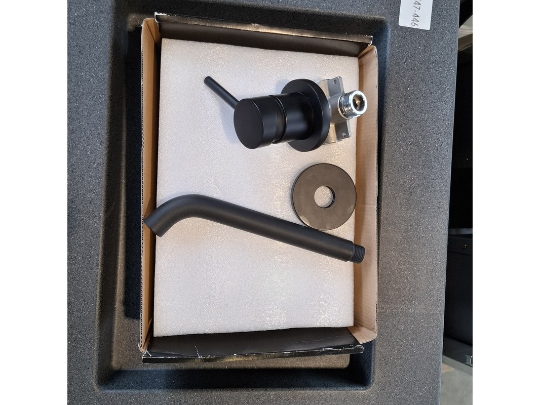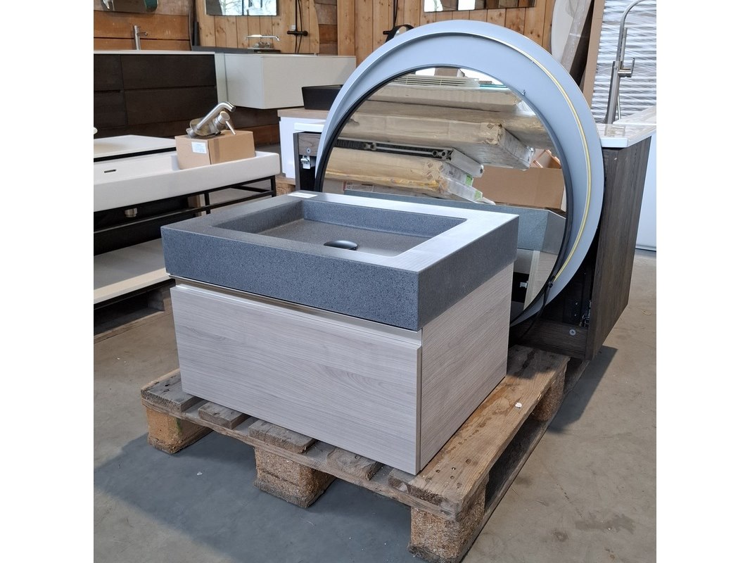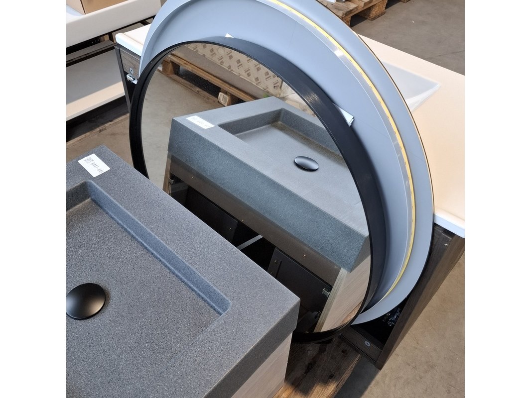 Product: Badmeubel Kleur: Grey oak Afmeting: 60x46cm Specificaties: 1 lade met softclose, polybeton wastafel, antraciet, inbouw wastafelkraan, mat zwart, spiegel, Ø 60cm, met mat zwart kader