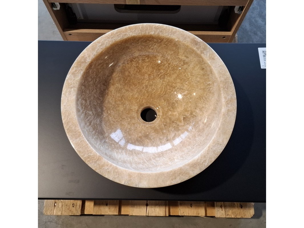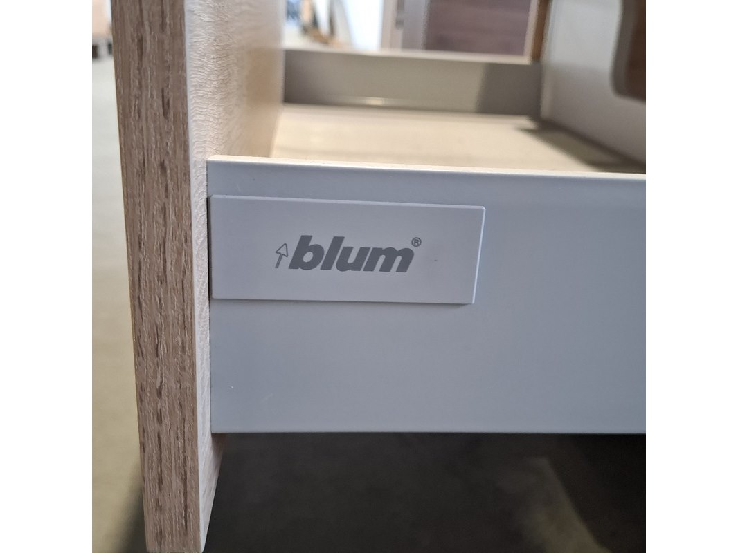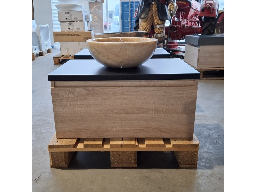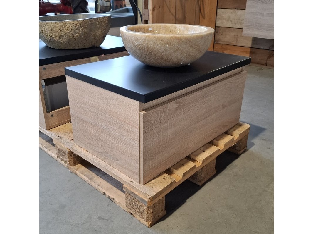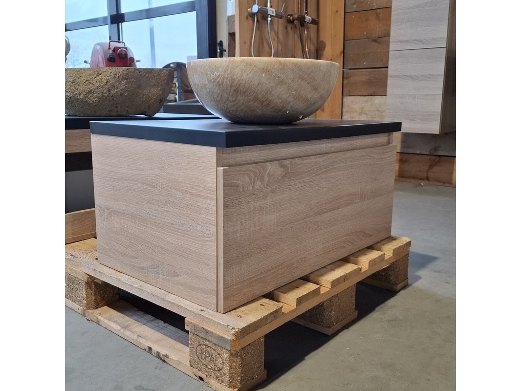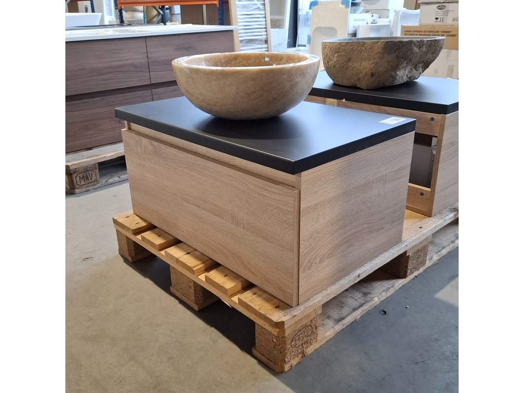 Merk: HR Badmeubelen Product: Badmeubel Kleur: Eiken Afmeting: 75x46cm Specificaties: 1 lade met softclose, met Blum lade-geleide systeem, greeploos, topblad matzwart, marmer waskom,