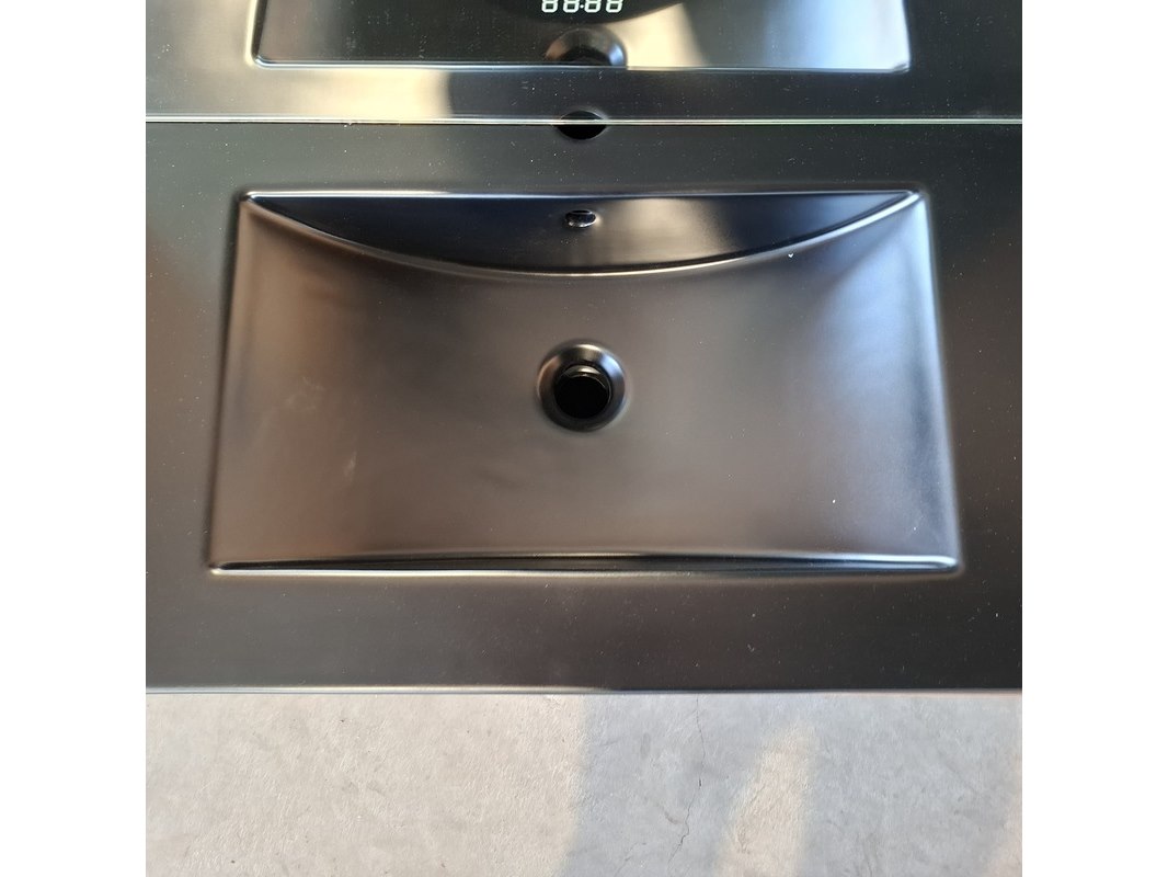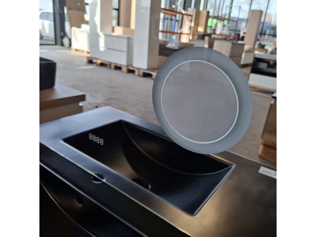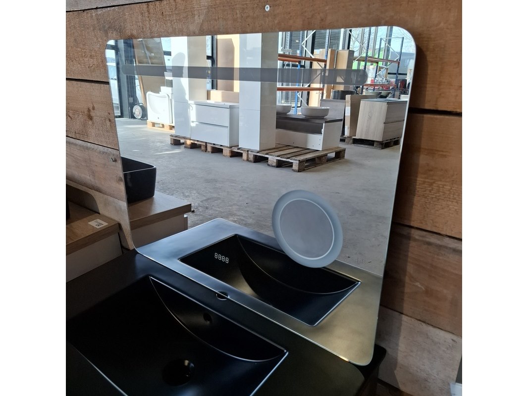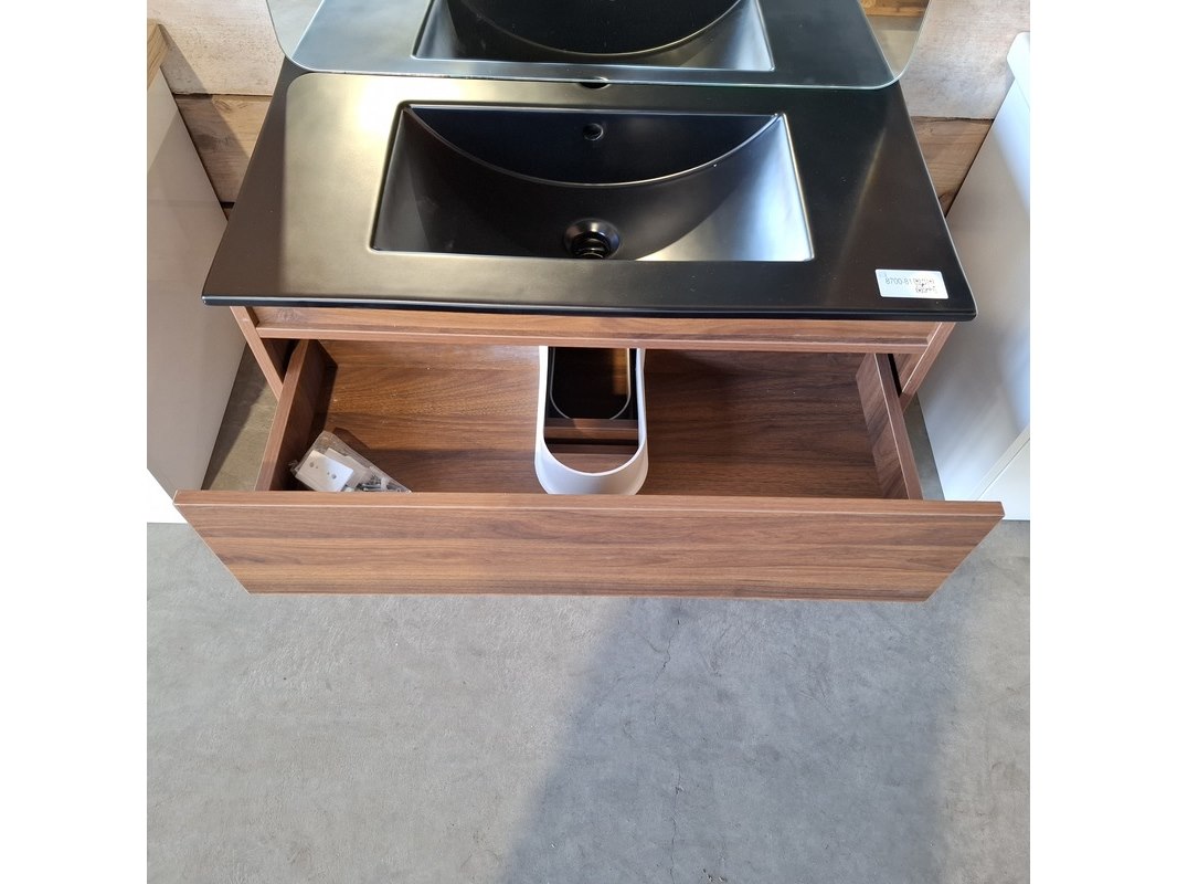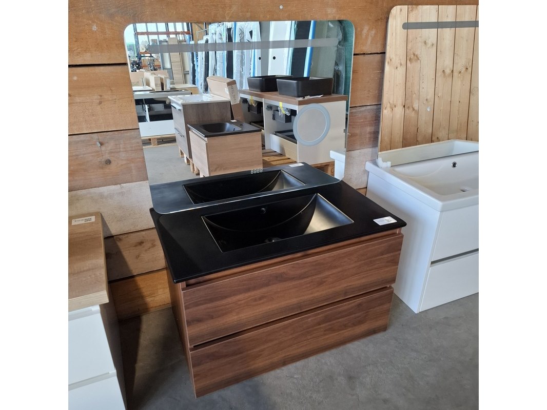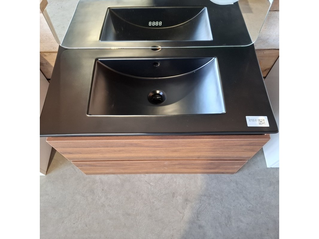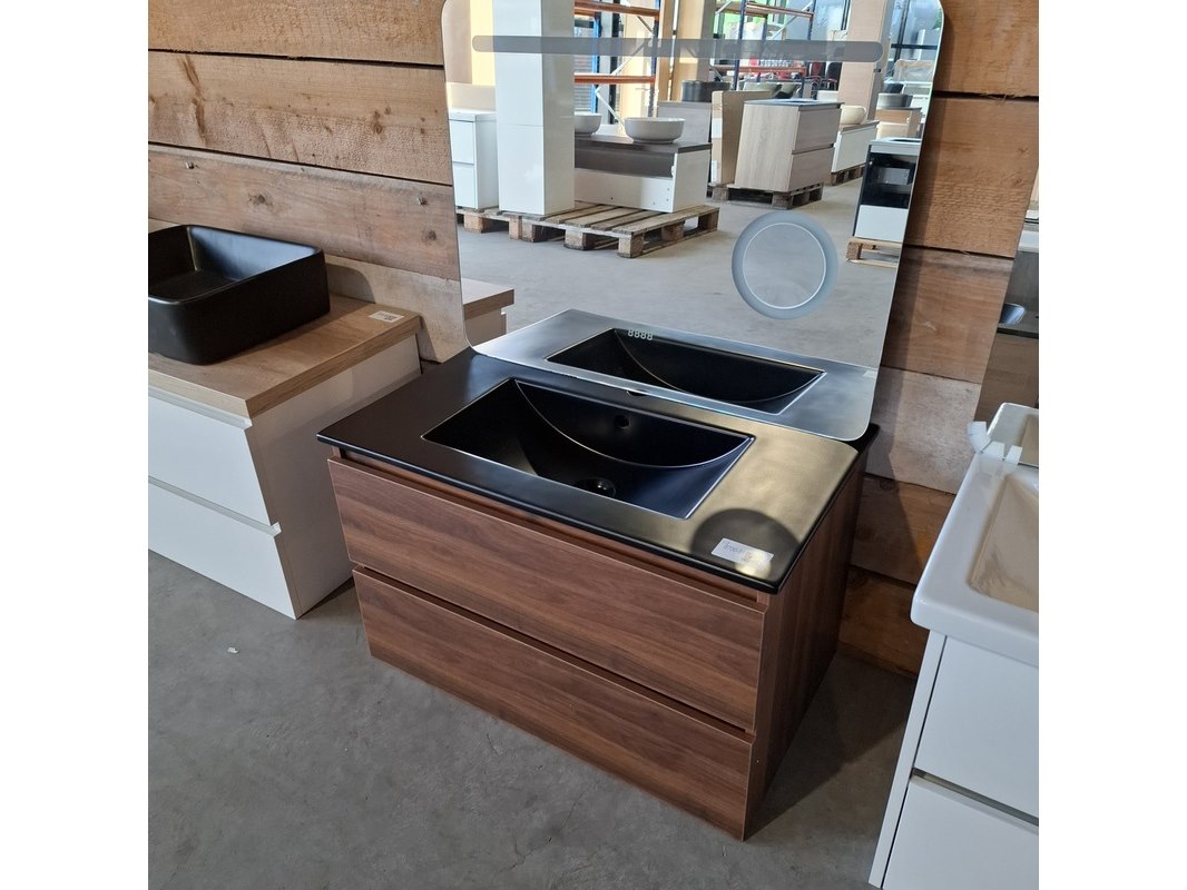 Merk: HR Badmeubelen Product: Badmeubel Kleur: Noten Afmeting: 80x46cm Specificaties: 2 lades met softclose, greeploos, keramische wastafel, mat zwart, spiegel, 80x60cm, 1 x LED balk boven, scheerspiegel met LED, met tijdsaanduiding